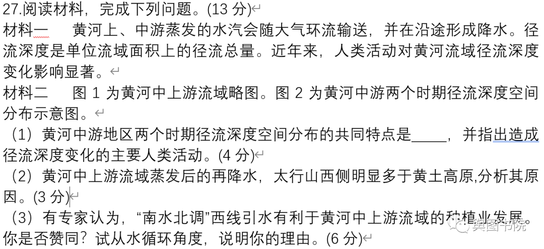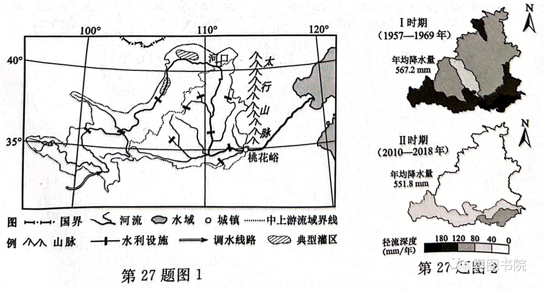 (1)由南向北递减;论述从人类用水角度切入,但是主要是工农业和生态用水。水利设施修建也会影响径流深度,答题从以上几点入手即可。