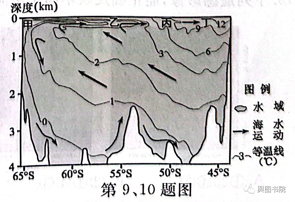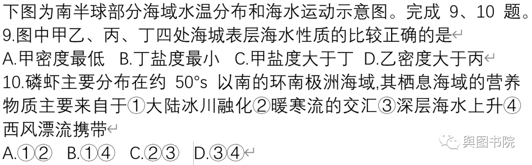 9D10C,考查西风漂流寒流性质,通过等温线结合洋流流向判断密度和盐度。第10题考查基本的洋流知识。