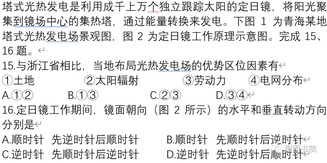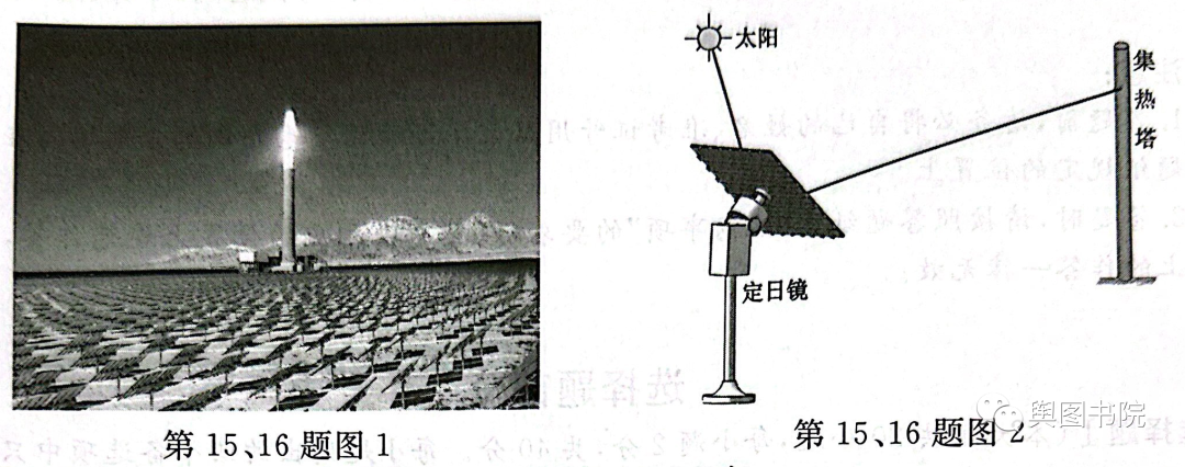 15题,集热电站是太阳能发电的一种,对光能和土地面积要求高。16题,结合太阳高度变化即可判断。