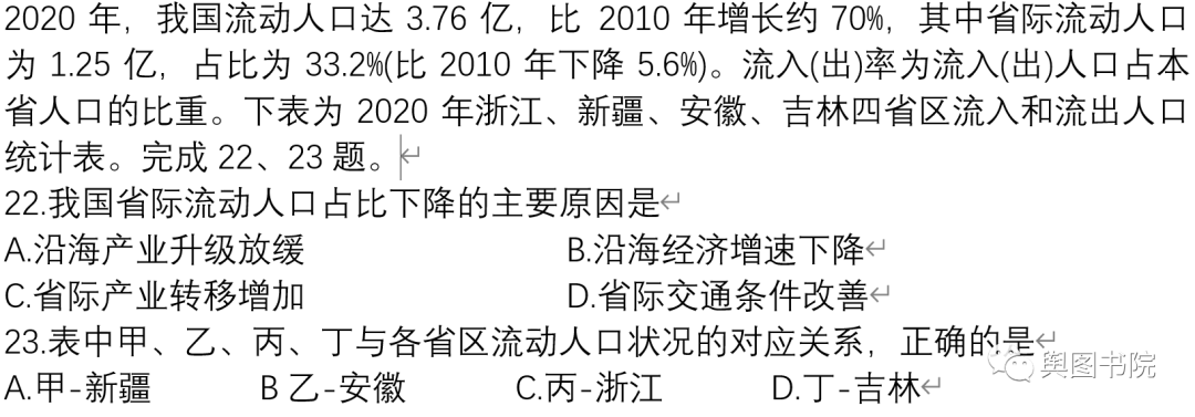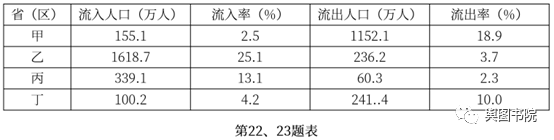 23题需要大致熟悉各省人口规模,通过流入或者流出结合比例估算各省的人口规模,结合经济发展现状对应的迁入迁出相对多少即可判断。