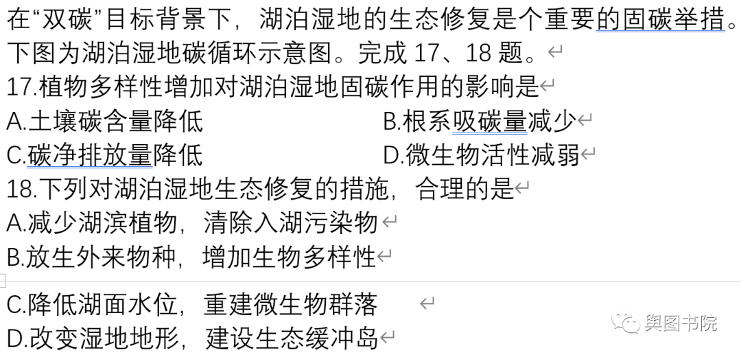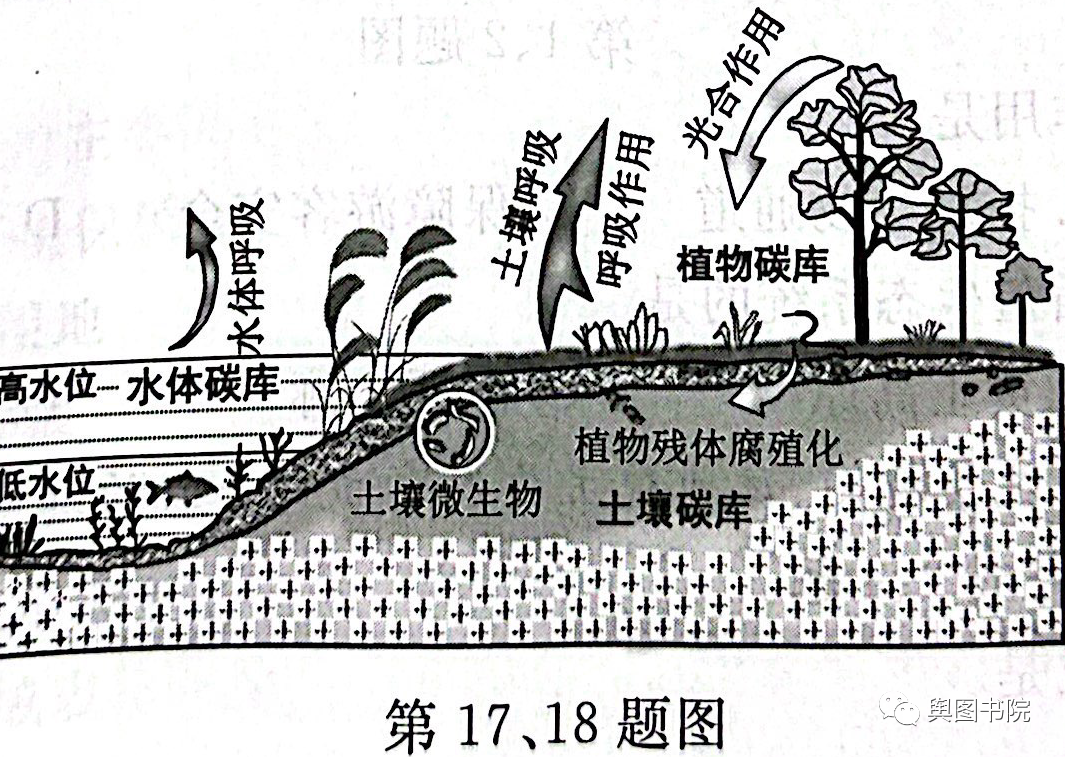 17题,植物多样性增加有利于固碳,提升微生物活动,降低碳净排放。18题,减少植物,降低水位,引入外来生物都不利于生态,生态缓冲岛有利于生态修复。