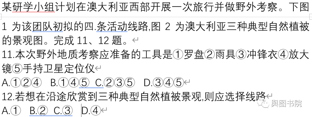 11题结合地质考察特点,需要特定的定位和观察仪器。结合澳大利亚的气候和植被图,可以分析从森林到草原再到荒漠的路线,应为③。