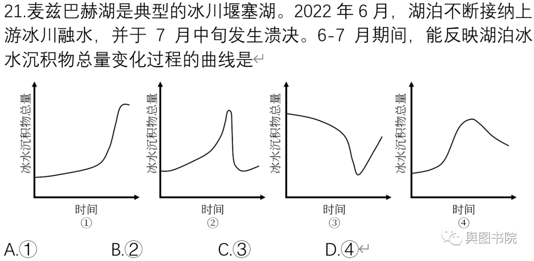 21考查湖水从堰塞到溃决过程中冰水沉积物的变化,结合图中信息分析可以得出沉积物随着堰塞体形成逐渐积累,而溃坝以后,沉积物快速下降。