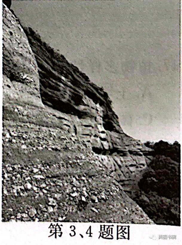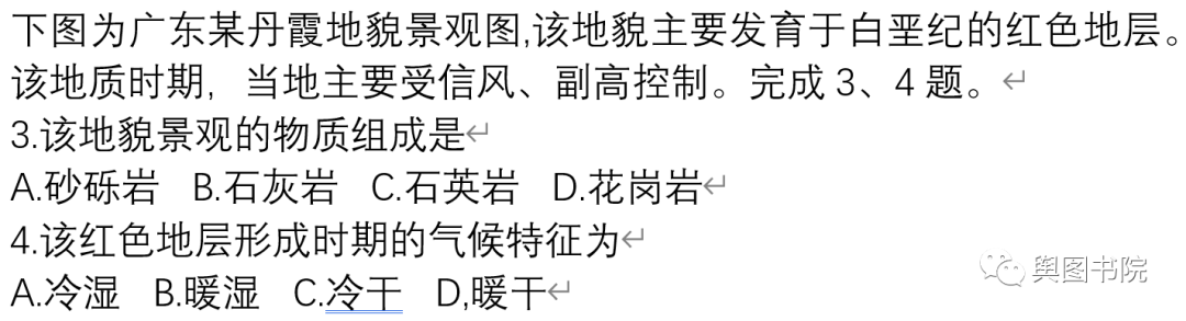 丹霞主要指红层陡崖地貌。主要是砂岩,砾岩构成,岩层具有块状结构和易于透水的垂直节理,因而容易在重力的作用下形成较为陡峭的崖壁。华南丹霞的红色主要来源于氧化铁,这是高热高氧化氛围形成的。基于以上知识,容易得出3,4题答案。