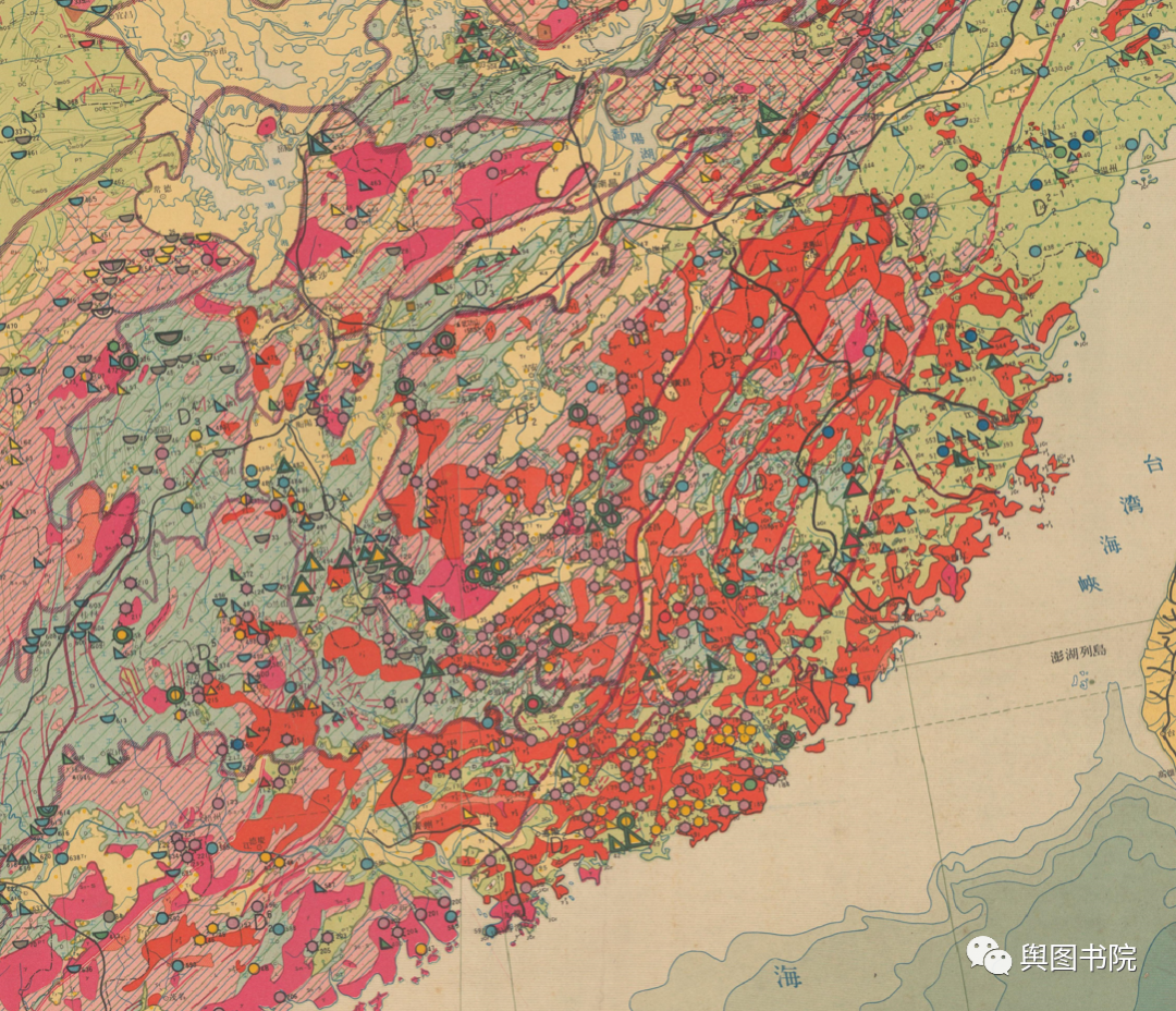 中国内生金属矿成矿规律图,图例如下,紫色为钨矿。如图可见中国钨矿分布,主要在江西,广东两省。