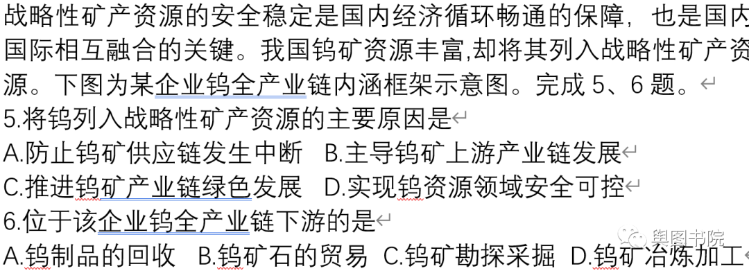 根据题目情景,第五主要基于资源安全考虑,第六题BCD均为上游产业,选择A。
