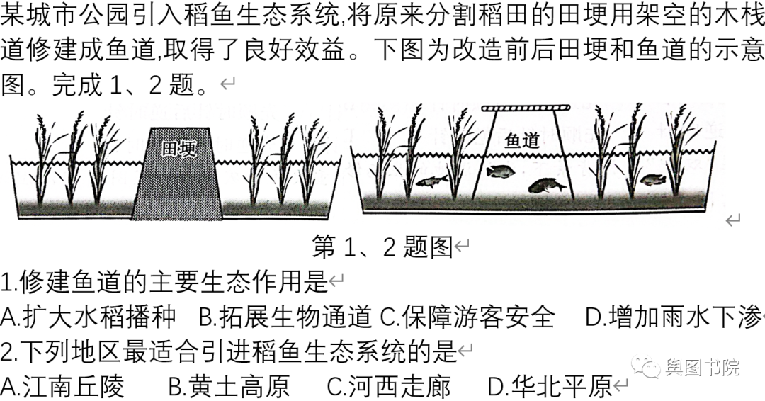 公园引入稻和鱼,可以增加水环境的生物多样性,提升物质循环效率,促进污染物分解。所以鱼道是拓展生物通道的作用。而水体适合湿润地区,比如说江南丘陵。