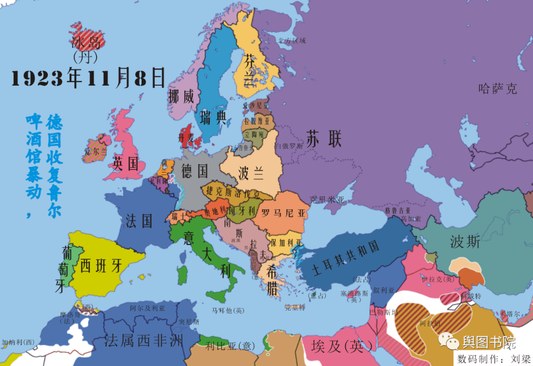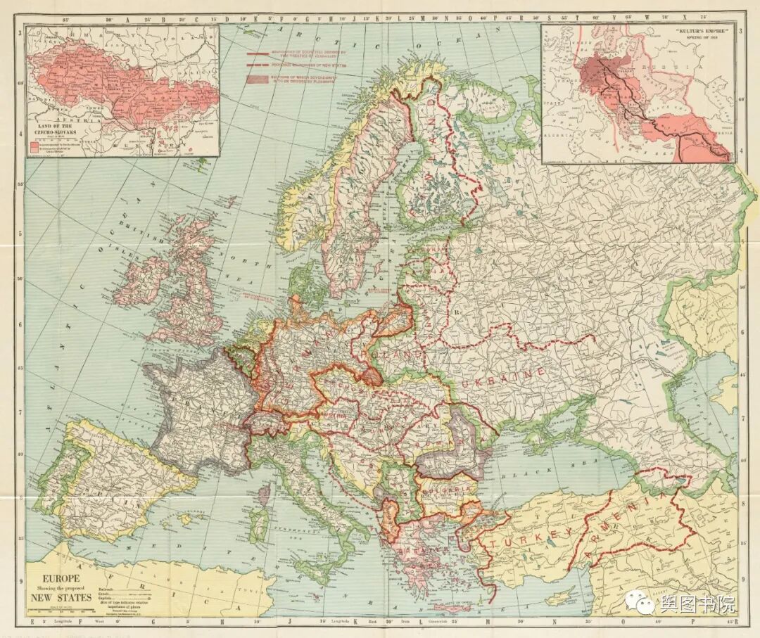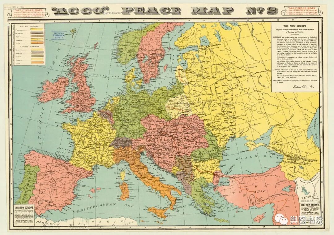这幅图展示了战争刚结束的时候欧洲版图变化,可以发现,1919年时候,乌克兰,波兰,立陶宛,爱沙尼亚,拉脱维亚,芬兰以及奥匈帝国境内的匈牙利,捷克斯洛伐克,南斯拉夫获得独立。土耳其被肢解,其势力范围全部被瓜分,本土被亚美尼亚,希腊占领,海峡变为公共水域。不过这些领土变化并没有完全实现,比如说土耳其最后出了一个“凯末尔”,将破败不堪的国家重新整合,成功保住了本土。而俄罗斯,虽然丢掉了大片领土,但是在二战苏德战争之前,又恢复了除了波兰芬兰以外的领土,还额外占领了原属于斯洛伐克的外喀尔巴阡。
