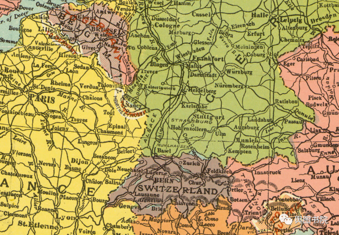 德奥在法国,比利时,意大利的占领区。意大利本为德国同盟国集团,开战后为了自己的利益,加入英法联军。但是意大利实力明显太弱了,面对已经两线作战羸弱不堪的奥匈帝国,仍旧接连溃败。开战不久,意大利北部的乌迪内已经被奥匈帝国占领。