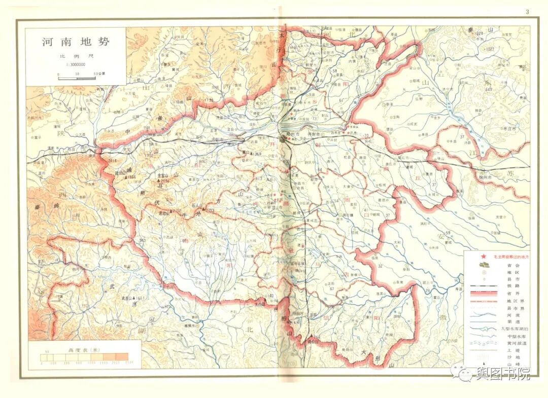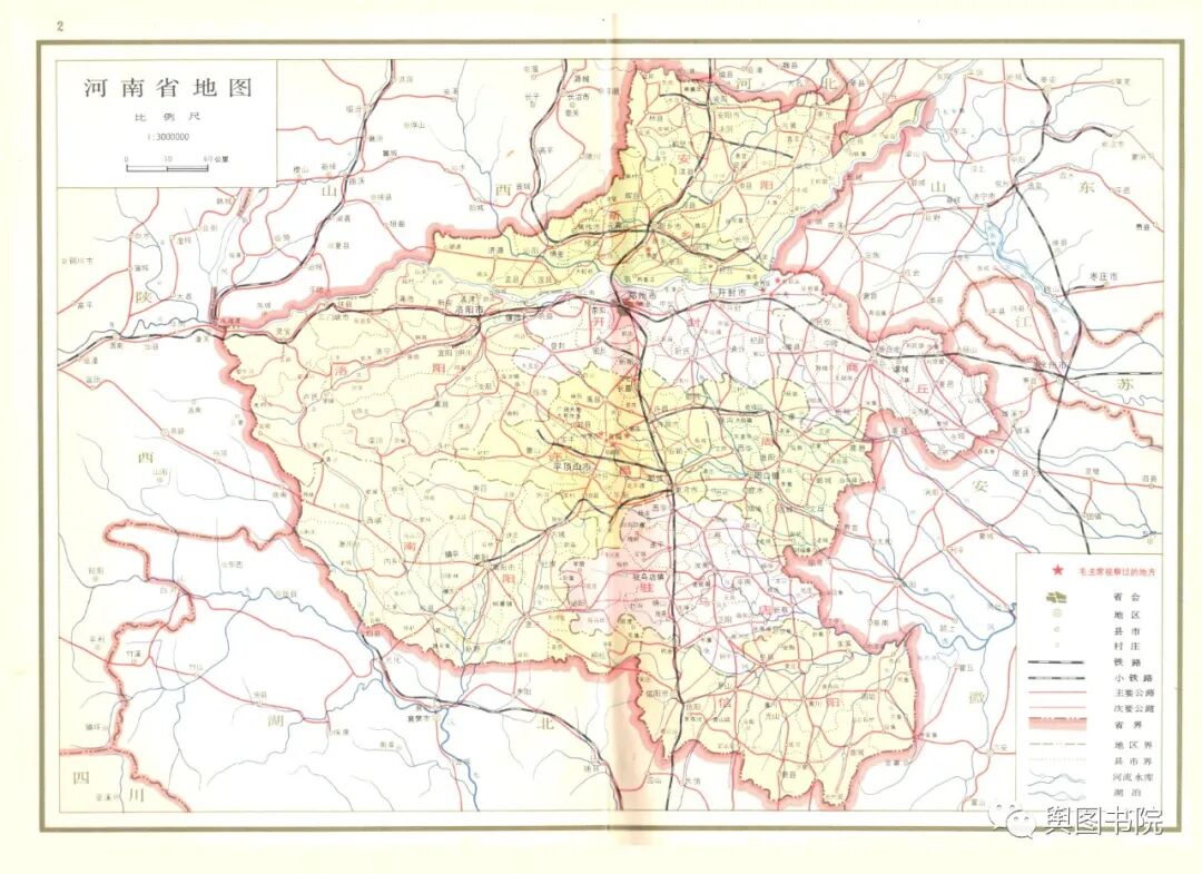 1970年河南有10个地区,4个地级市,10个县级市。地级比今天略少,但是比60年代初要多一些。图例中第一行五角星标注“视察过的地方”,也是图集特色之一。