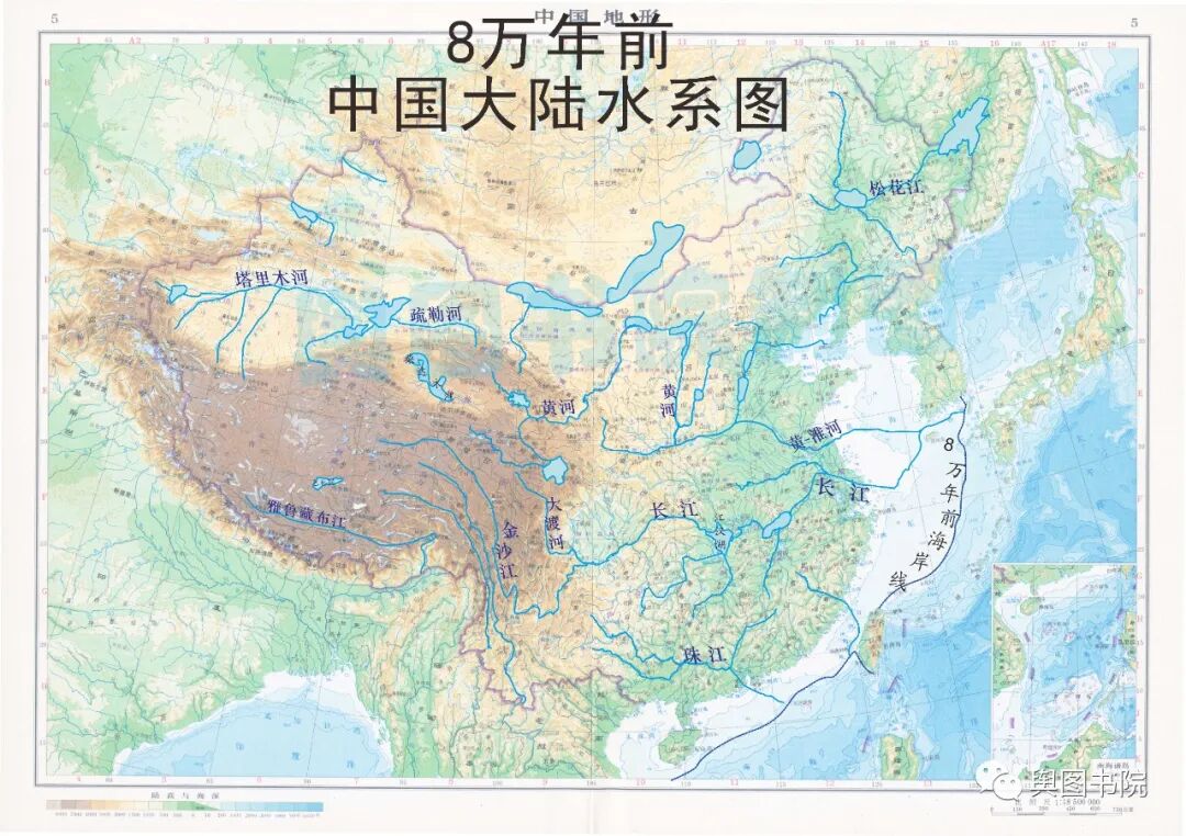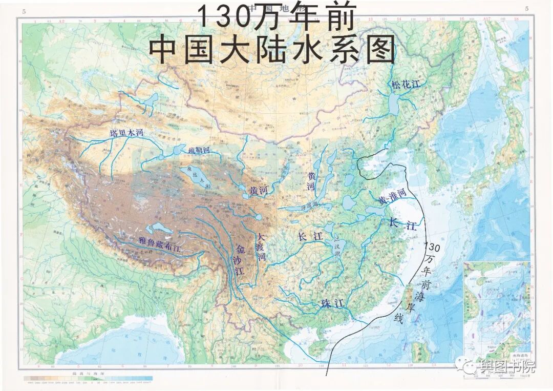 从地质尺度看,黄河历史并不悠久。今天的黄河河槽发育是260万年以前的事情。几百万年对于地质时间来说,不过是沧海一粟,白驹过隙。260万年以前喜马拉雅运动B幕开创了部分河流强劲侵蚀的历史,随后古江河开始发育。下图展示了130万年以前中国水系图。图中可见黄河一部分河槽已经发育,但是黄河上中下游并没有沟通。