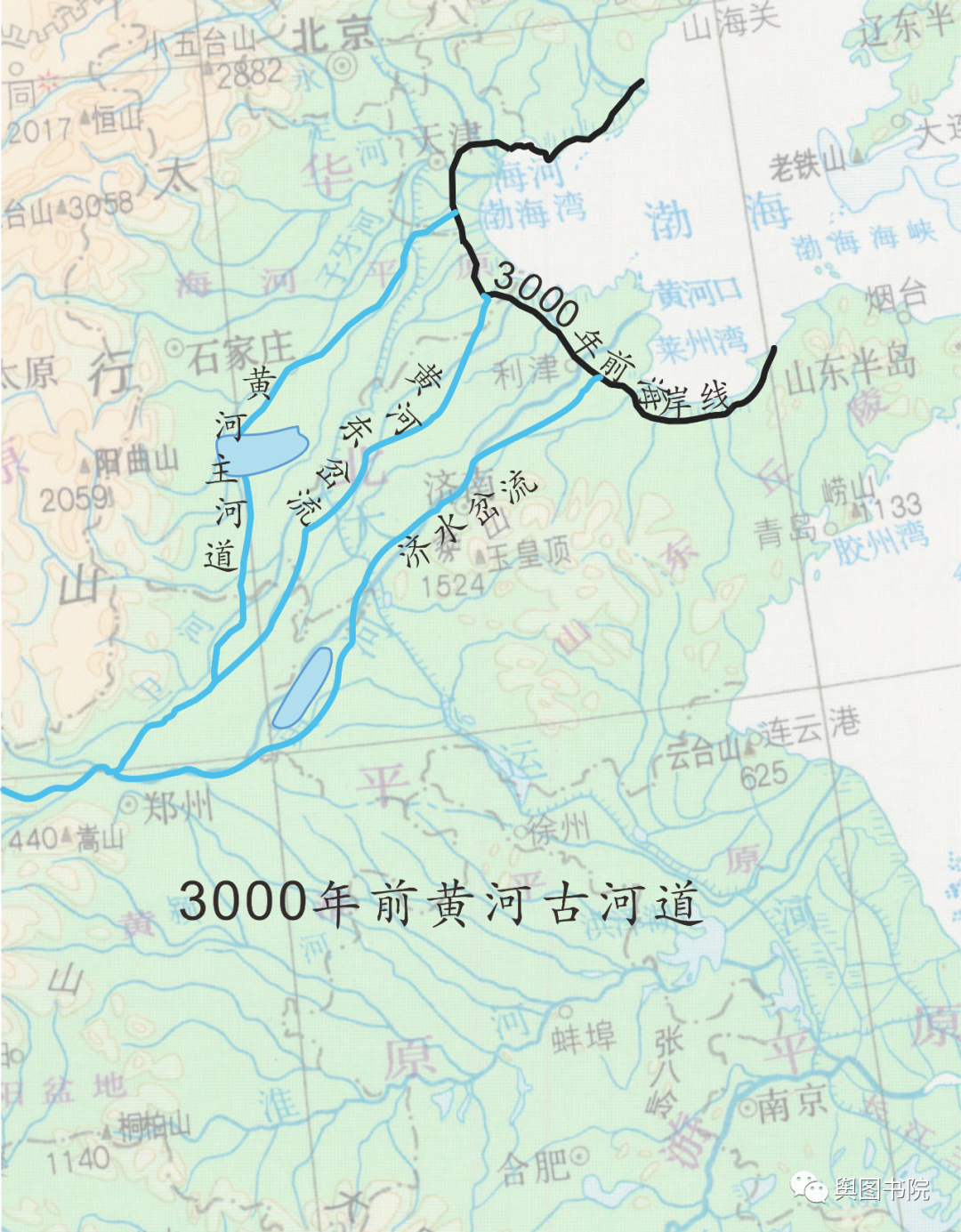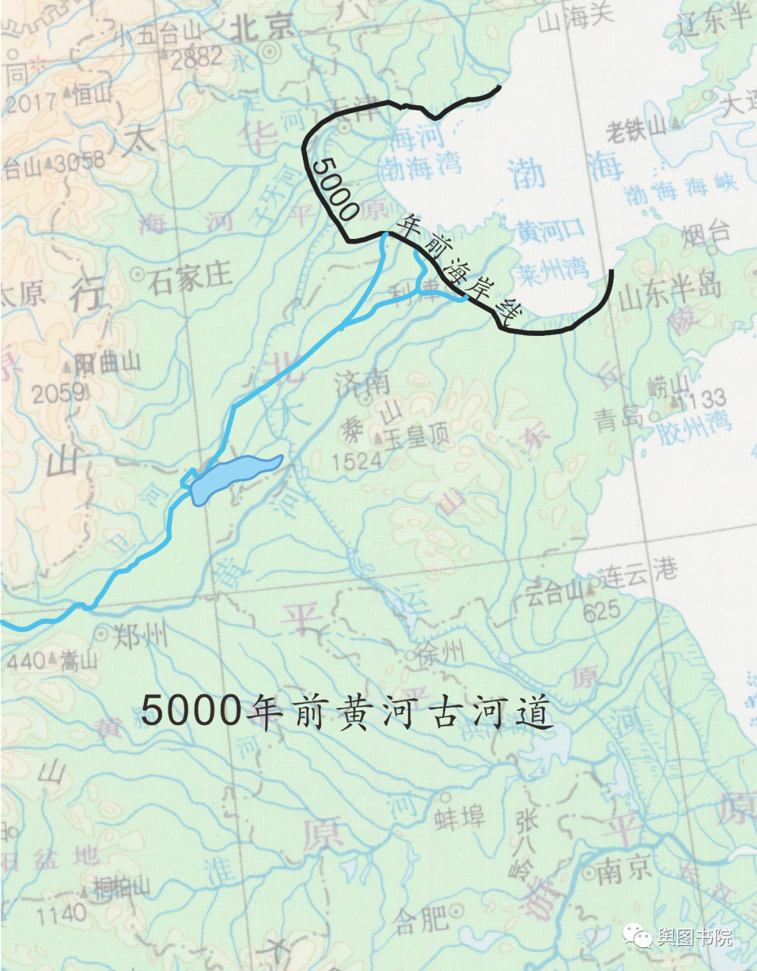 5000年前,随着气候变化,太行山口沉积物增多,黄河河道东移。