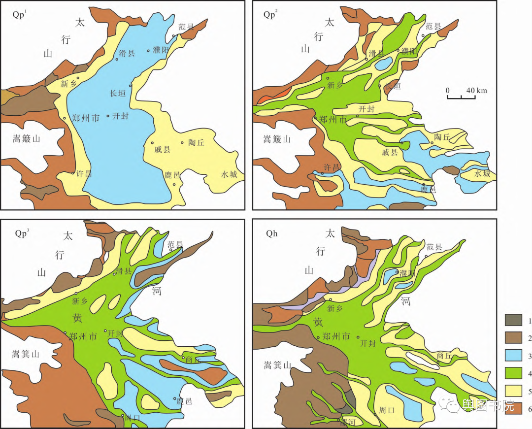第四纪以来黄淮一带演化图:数字1表示山前冲洪积地带;2表示含黄土地层;3表示湖泊相;4表示河间带相;5剥蚀区。相关地貌学习可以参考之前图文→经典等高线地形图,彻底弄懂构造地貌和流水地貌。