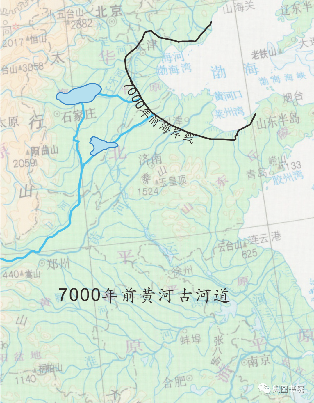 仰韶文化时期黄河和海岸线,此时黄河仍在太行山麓洼地一带流淌,沿线有许多沼泽湖泊。