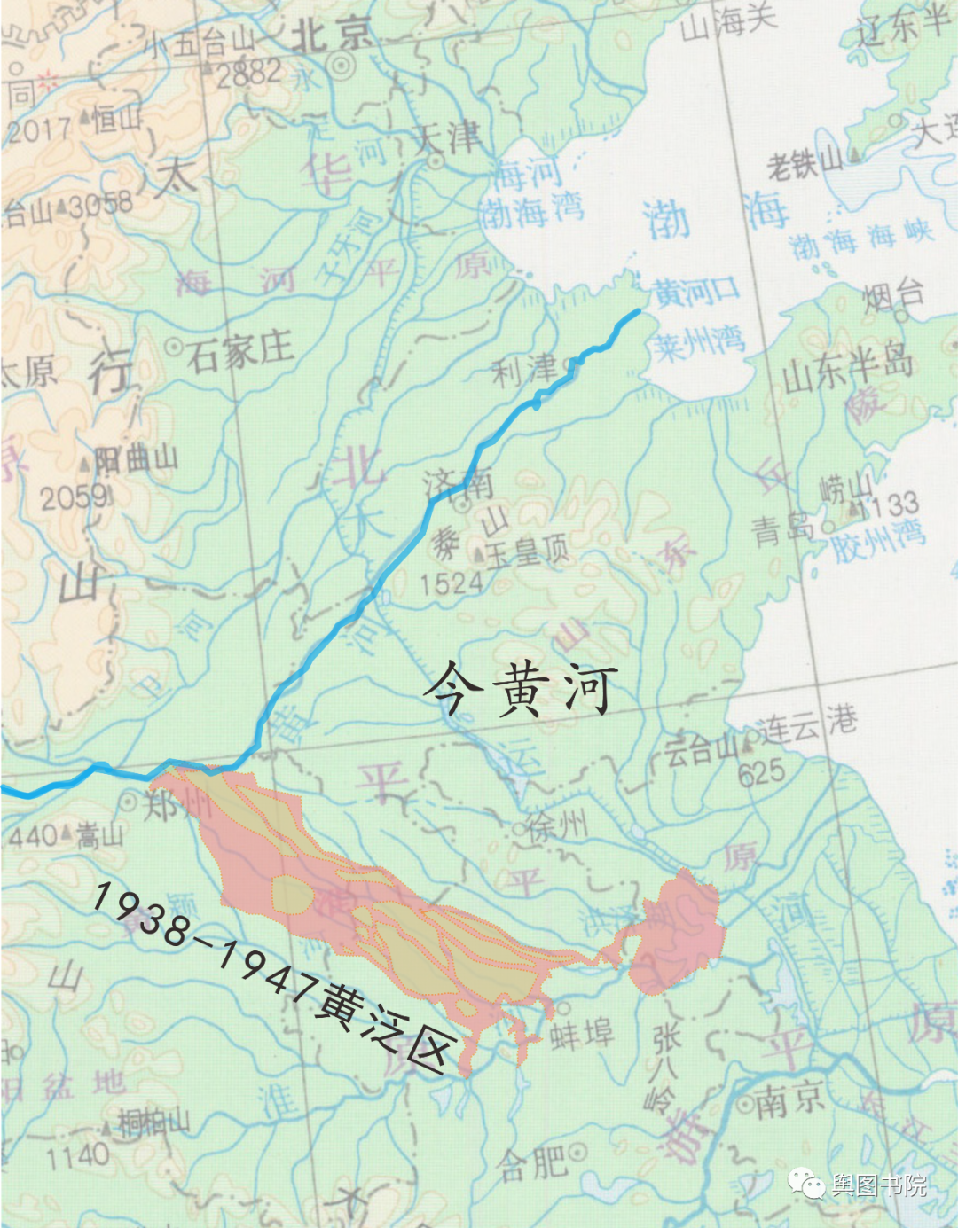 1855年铜瓦厢决口,黄河北去。逐渐形成今河道。1938年黄河花园口决口,再次从徐淮故道入海,并形成图中所示巨大黄泛区。