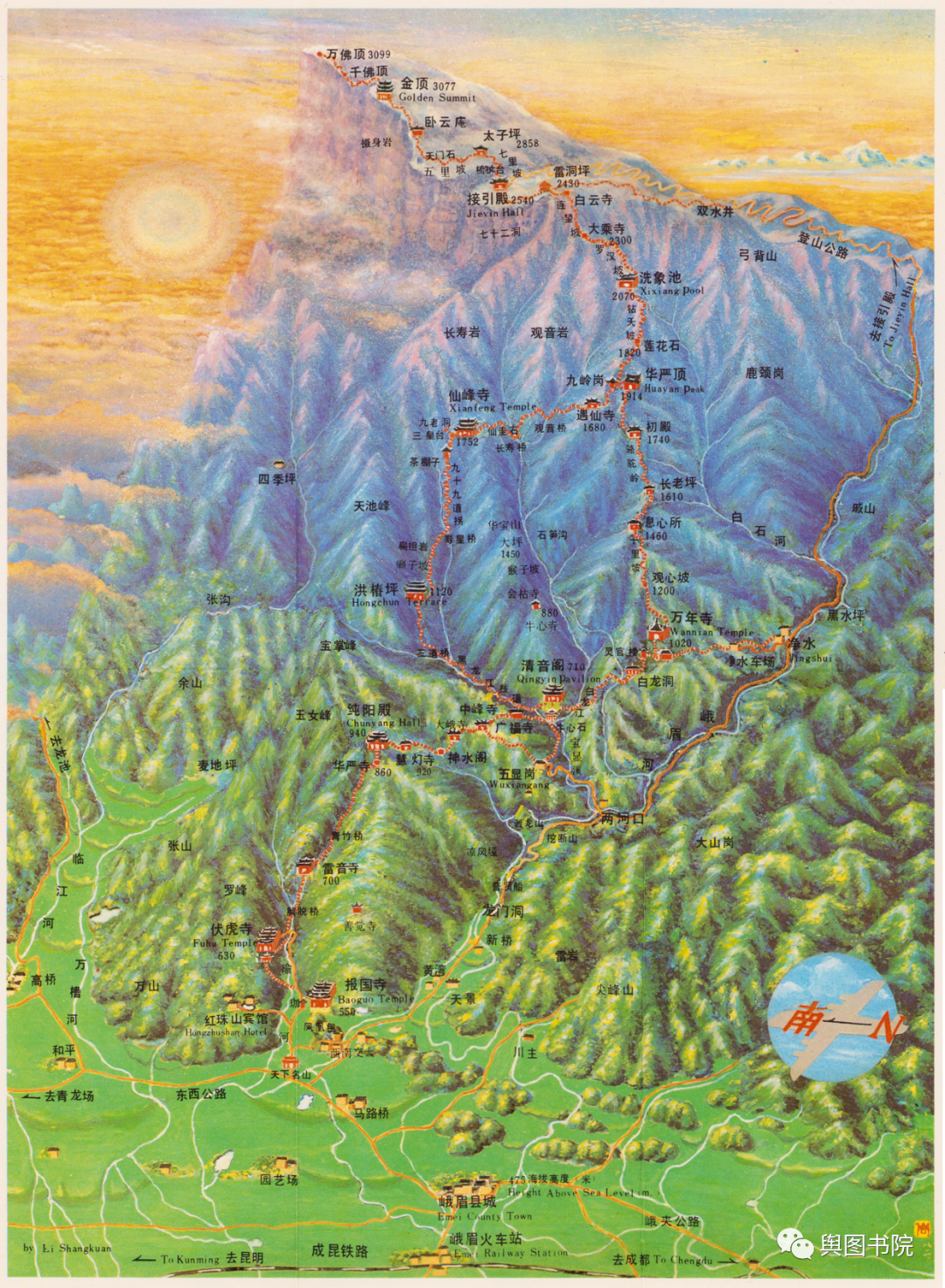 这幅峨眉山旅游图是著名地质学家李尚宽绘制的,在那个年代,地质素描等基本绘画功底是学习地质必备技能。我们仔细欣赏地图,可以发现地形地貌和旅游路线,地名景点,交通路线等信息一应俱全,而写意又非常真实的地形描绘,把峨眉山的雄浑壮阔尽收眼底。单从绘画角度看,这也是一幅非常精美的山水画,不论是构图还是色调,都非常完美,内容多而不臃肿,色彩鲜明而不凌乱。峨眉山是中国四大佛教名山之一,图幅也恰到好处展示了佛教的庄严肃穆。