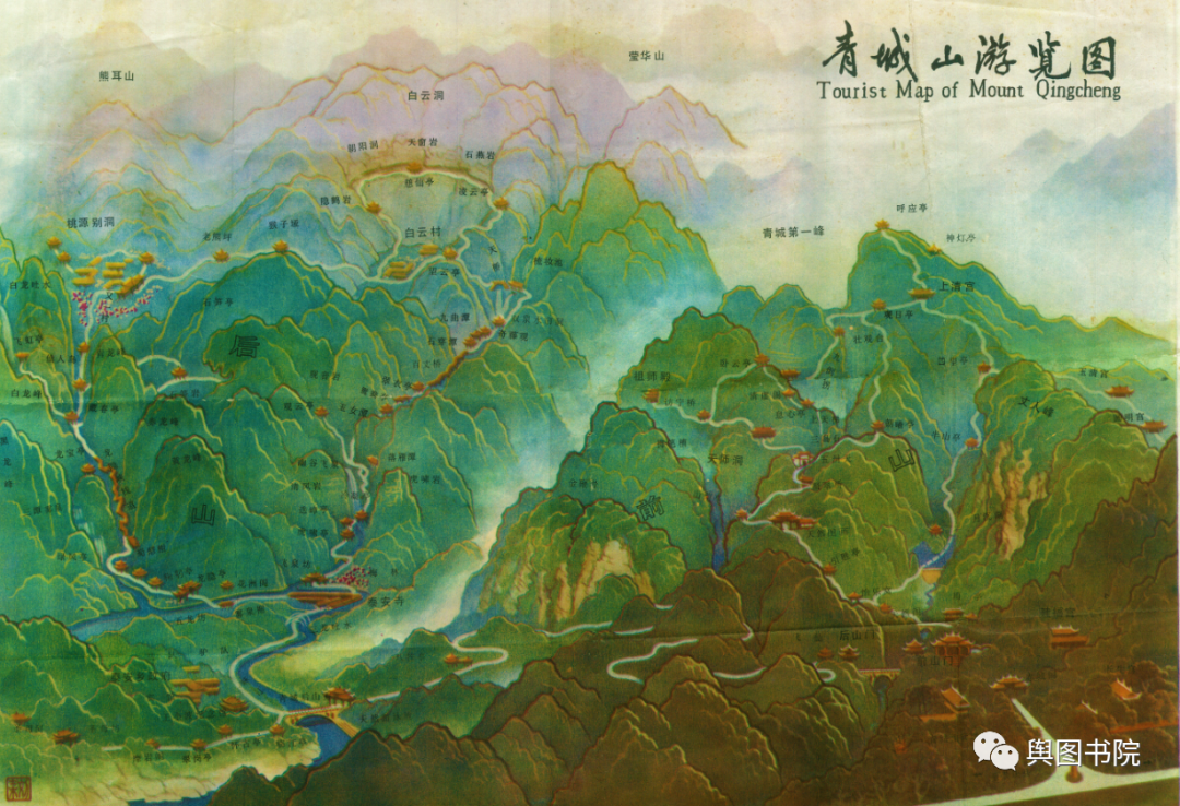 青城山也是中国著名的道教名山,这里也是古蜀国发祥地。这里背靠邛岷千里雪山,俯瞰坦阔如面的川西天府平原。古往今来,青城山以林泉清秀,景色清幽,高山峡谷,动植风貌以及古道宫观和历史遗迹,吸引了众多游客。自古以来就是风景名胜之地。这幅水墨画风的旅游图,将古香古色和景区风景完美融合,是地图和国画艺术的珍宝。