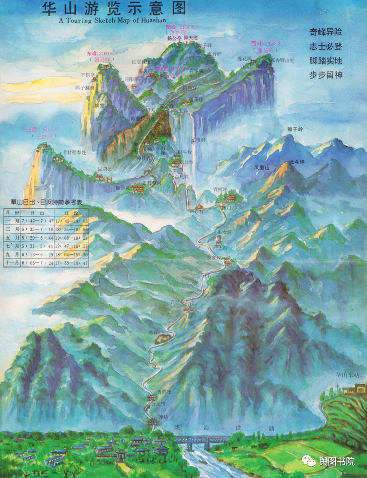 这幅地图,将华山险峻描绘得淋漓尽致,而图中附带的日出日落时间,说明夜登华山赏日出是很早就有的一个传统。