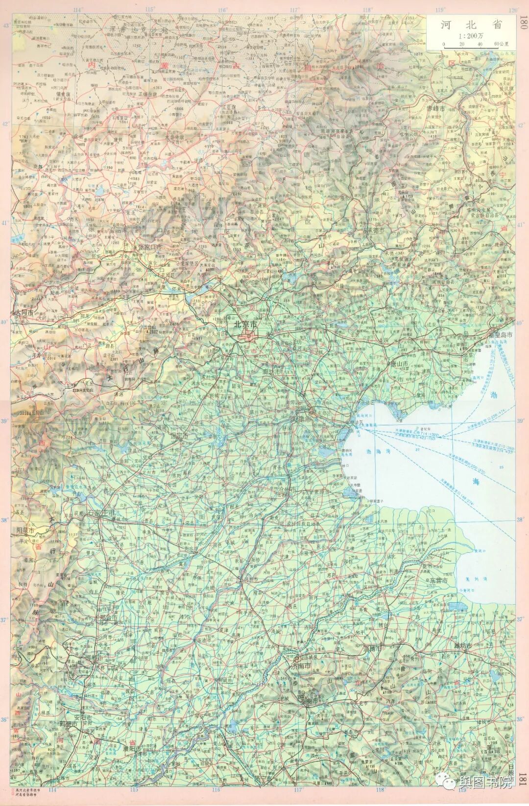(河北地形图,1992年。这幅等高线分层设色叠加地貌晕染的手工地形图,直观展示了河北地形地貌 )