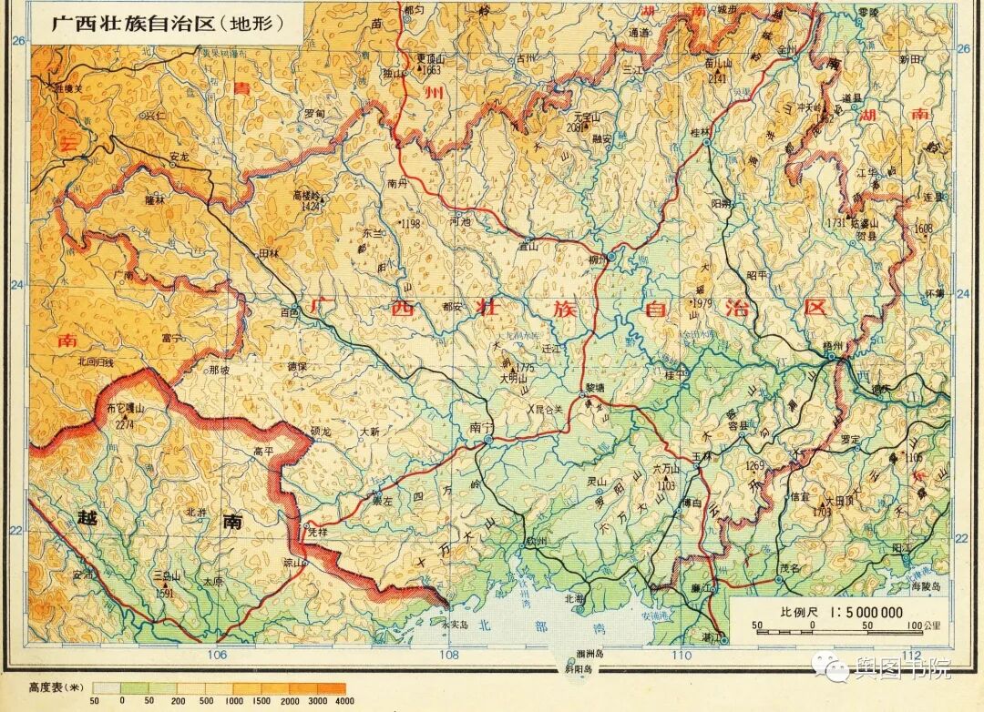 (广西地形图,广西绝大多数水系都汇入广西东部梧州截面这里,从另一个角度看,广西的中心就是梧州,这也塑造了传统广西的地理和交通格局)