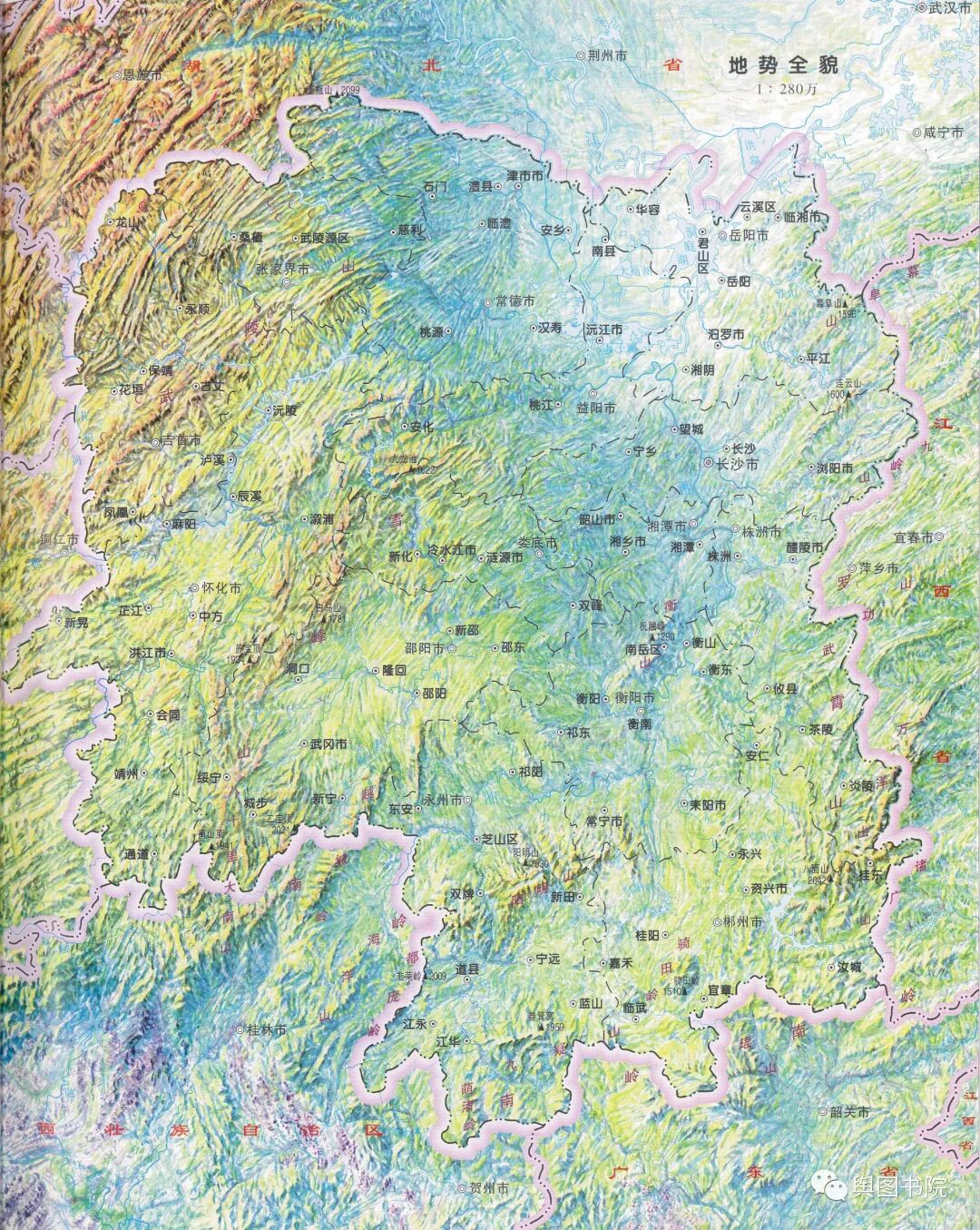 (湖南省地势图,2000年,水墨晕染图,敬请欣赏)