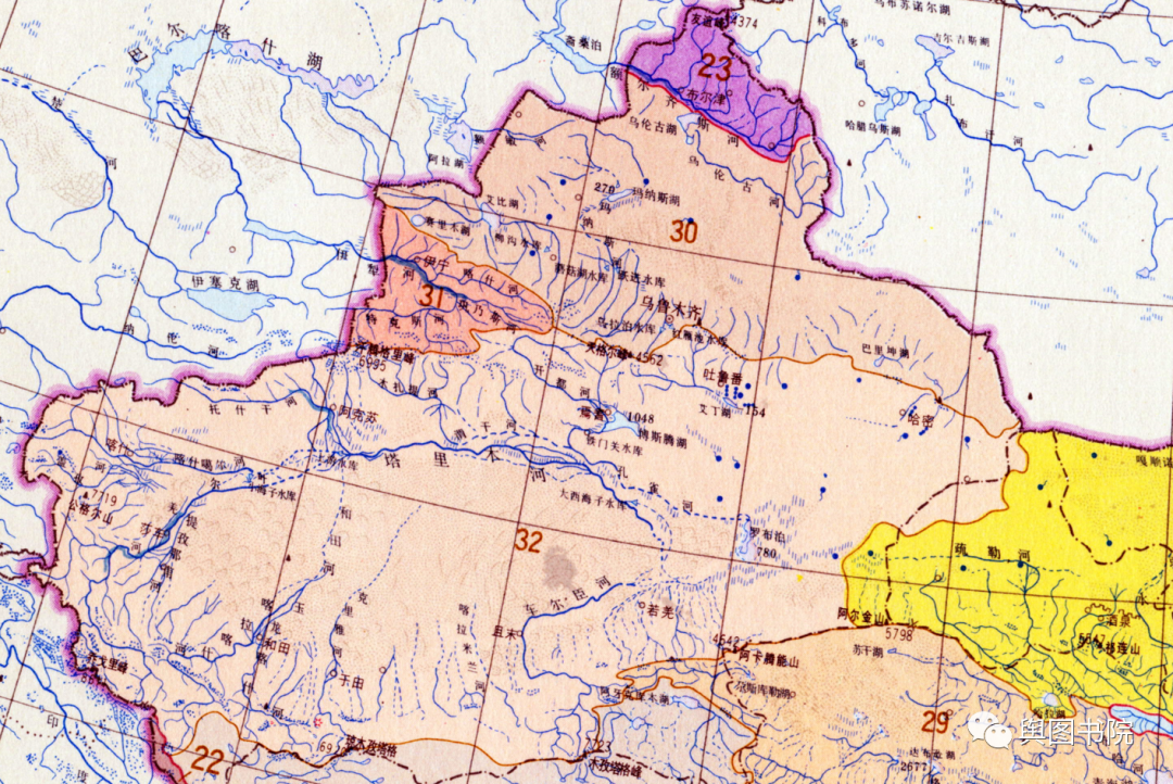 (中国水系图新疆部分,图中32表示塔里木内流区)
