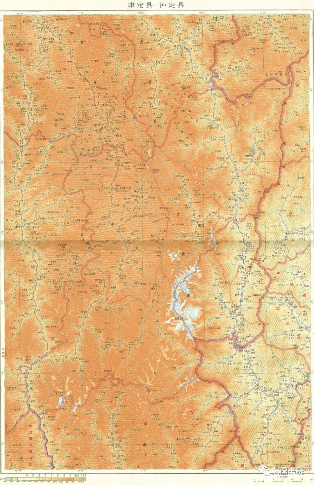 (康定,泸定地图,点击可加载大图。贡嘎山位于高原最前缘,但一柱擎天,高耸入云)
