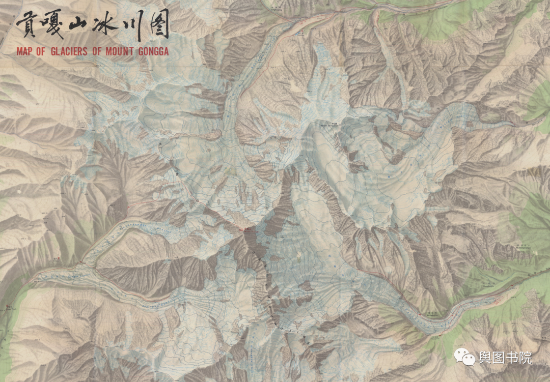 (贡嘎山附近地形图,东侧的燕子沟,磨子沟,海螺沟等都发育了巨型冰川)