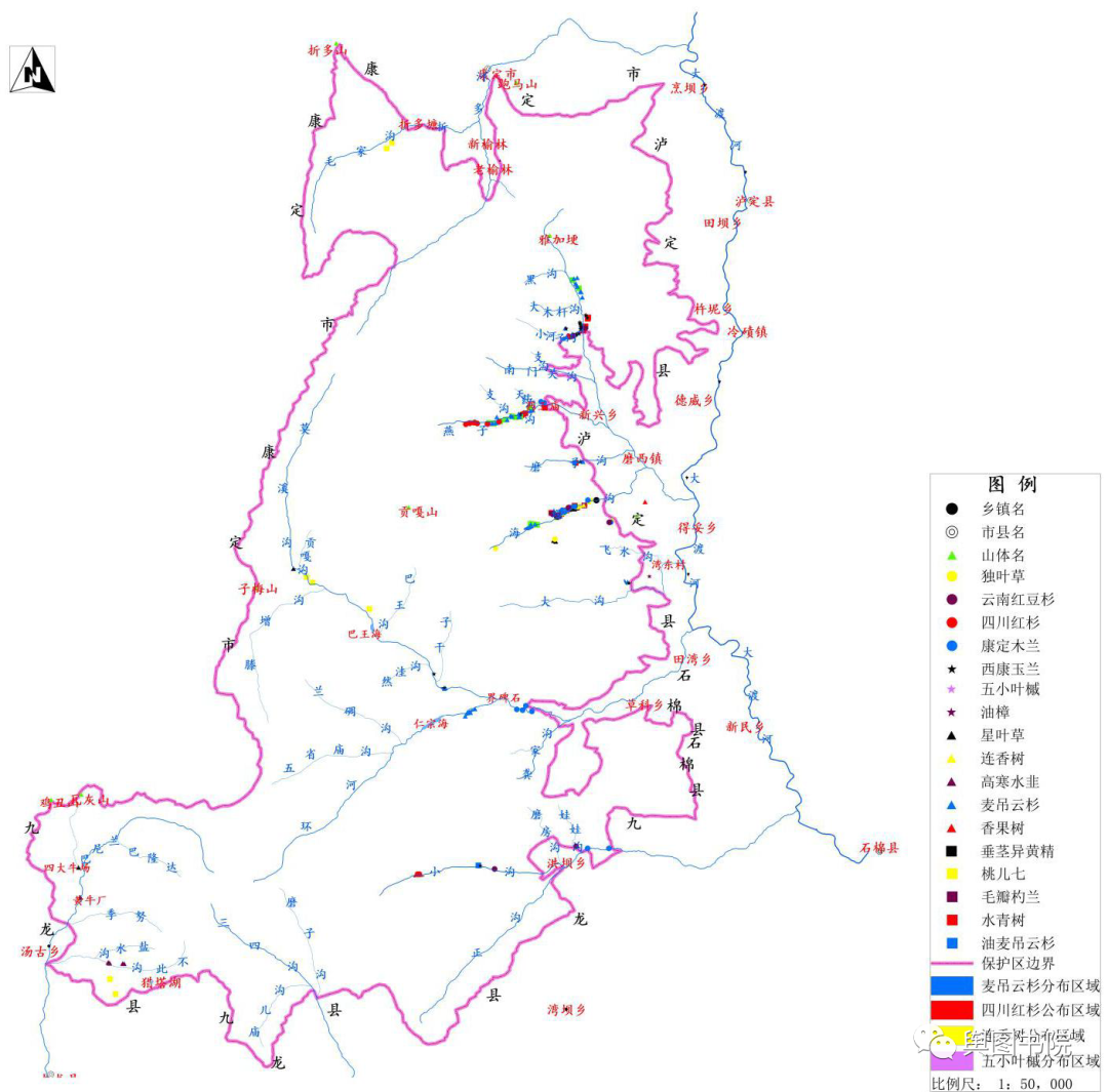(贡嘎山保护区重点保护植物分布图)