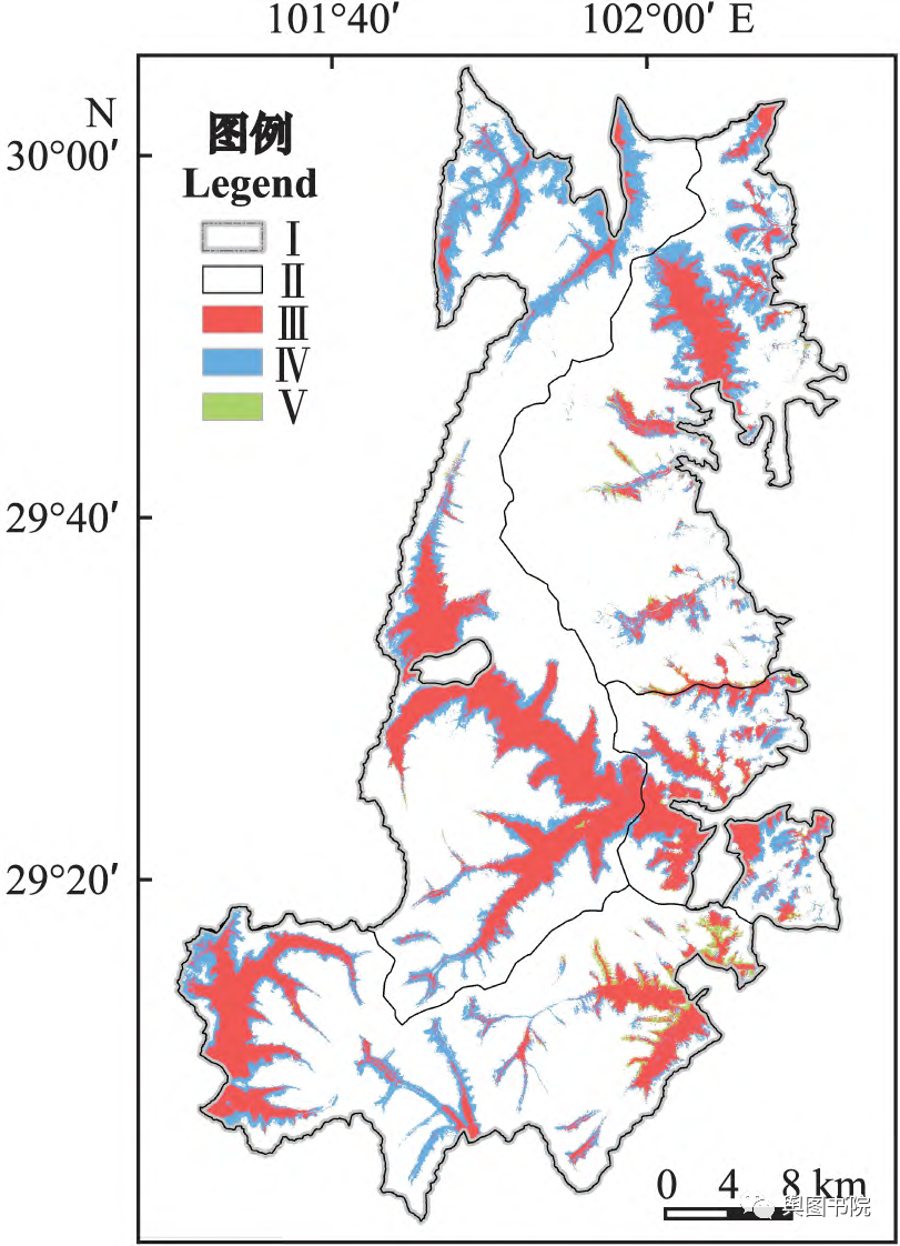 (贡嘎山中华斑羚和中华鬣羚栖息地示意图,红色为共同栖息地,蓝色是斑羚栖息地,绿色的鬣羚栖息地)