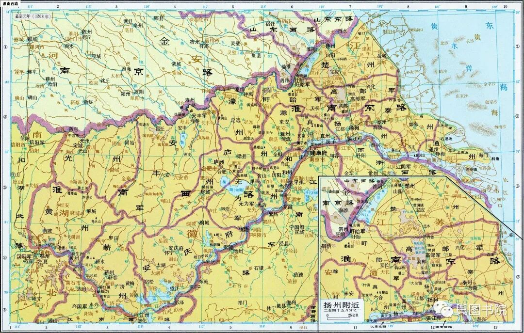 (南宋1208年形势示意,淮河依旧是南北政权对峙前线)