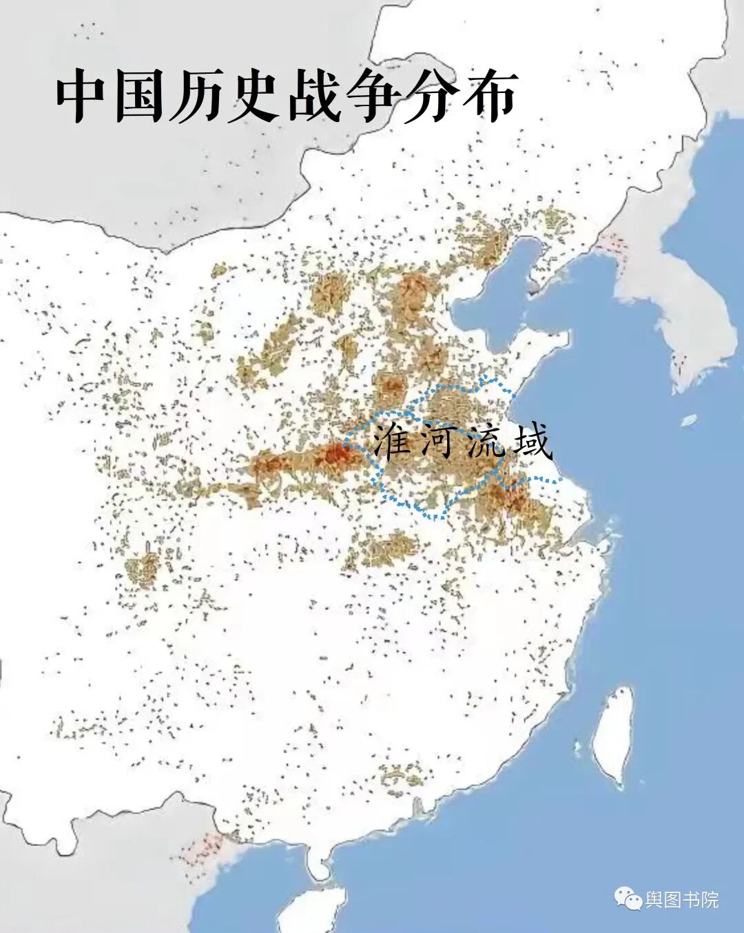 (中国历史战争分布图,我们发现,淮河流域是中国战乱最密集的区域之一)