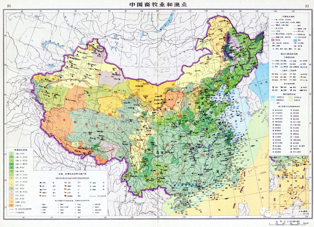 (畜牧业和渔业图,淮河还是诸多牲畜水产分布界限)