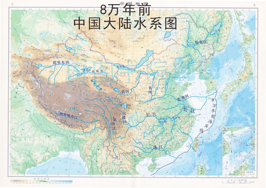 (130万年前水系图,淮河(古黄河下游)已经形成,但是黄河中上游尚未贯通,当时的汾渭湖是一个没有出口的咸水湖)
