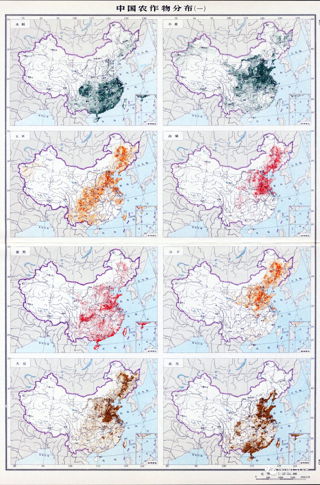 (中国农作物分布图,诸多农作物密集种植界限在淮河)