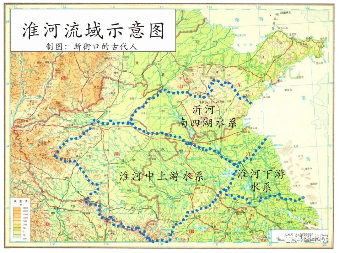 (淮河流域示意图,制图新街口的古代人。淮河上游是巨大的扇形水系,下游是平原网状水系,又由于人类开发历史悠久,运河纵横,是中国河流密度最高的地方。由于废黄河影响,沂河和南四湖水系被切割开)