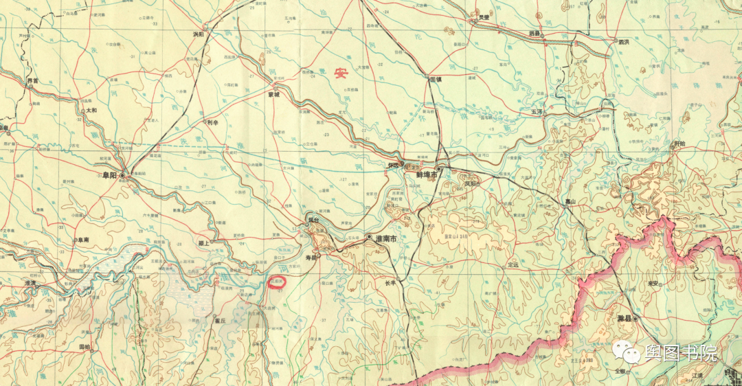 (中国地貌图,1比100万南京幅。图中可以看到,淮河两岸地貌有天壤之别,南岸是典型的南方丘陵地貌,北岸是典型的北方平原地貌)