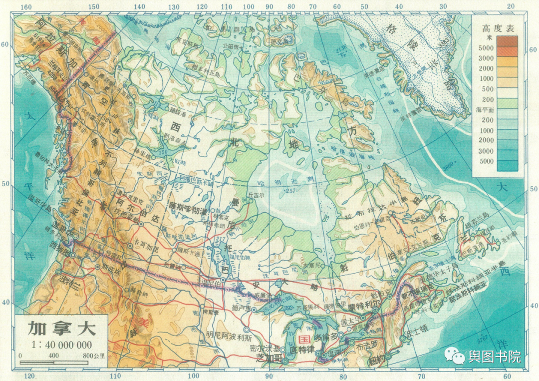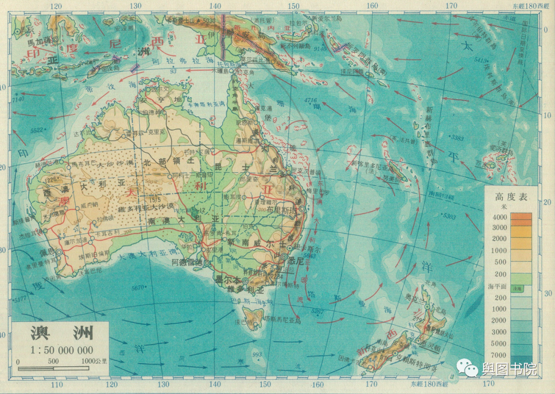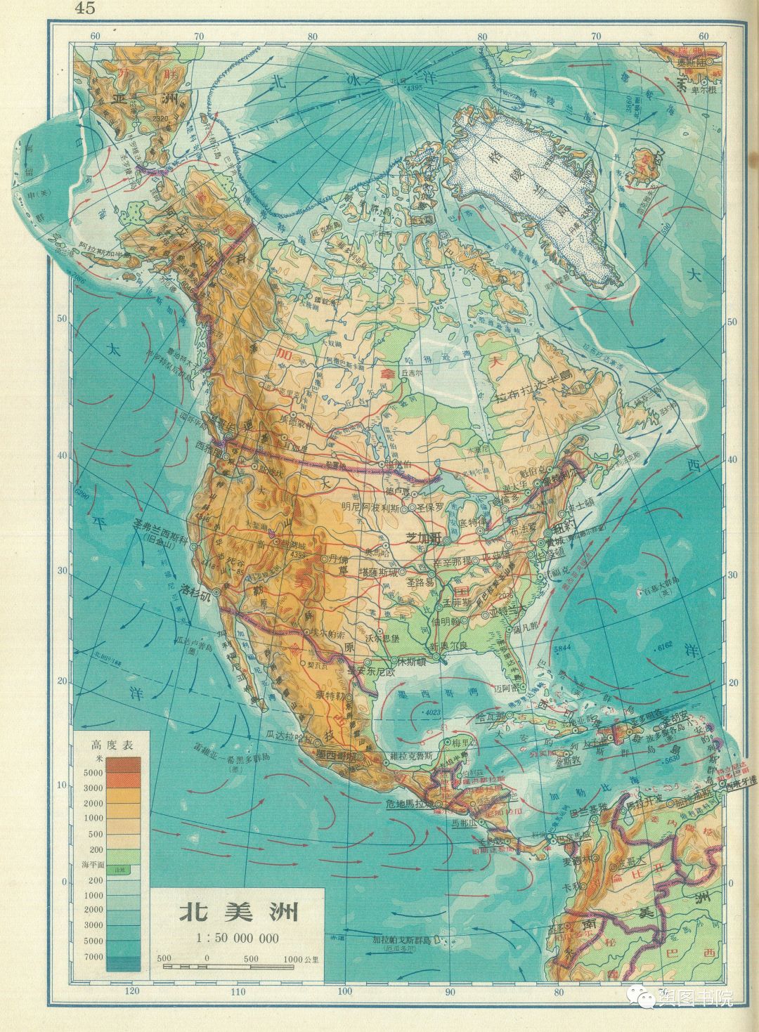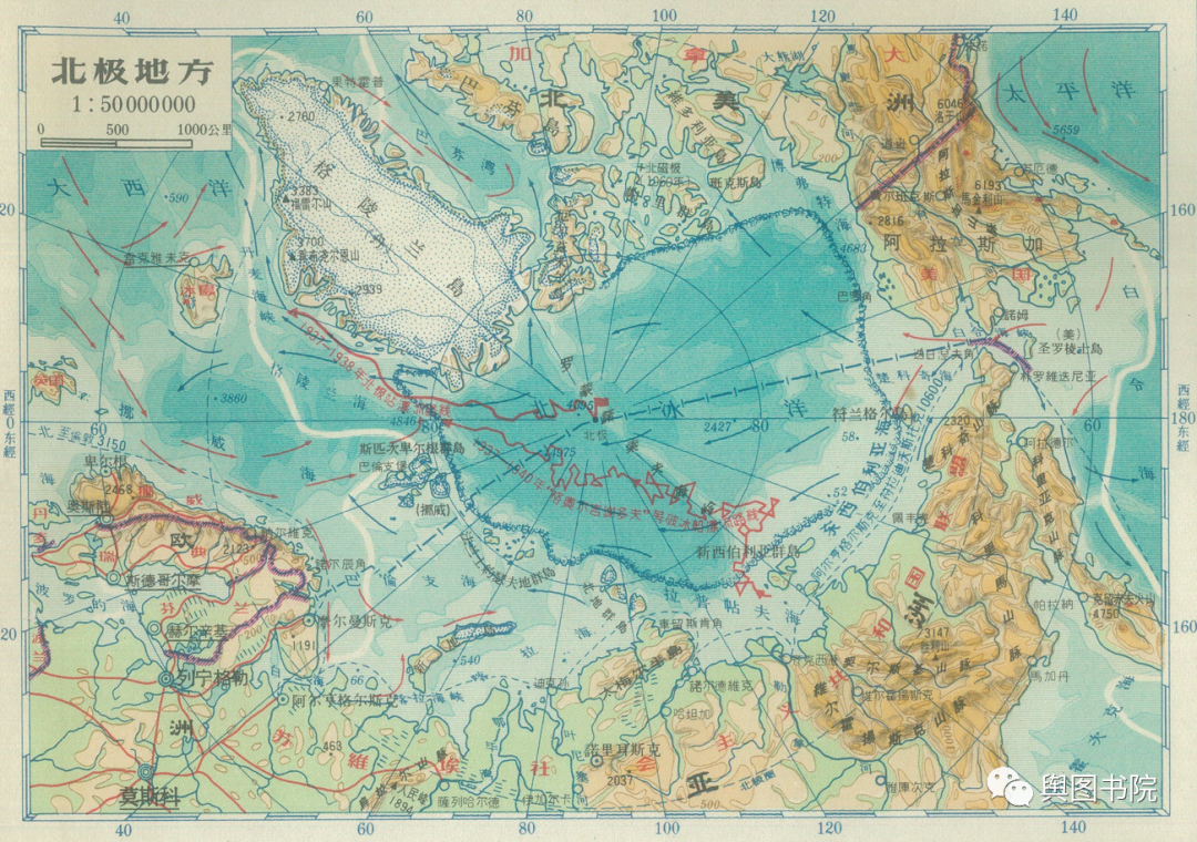 这幅图地形风格依旧沿用苏联风格,等高线分层设色的色谱,还有洋流等符号,都沿用苏联图式。