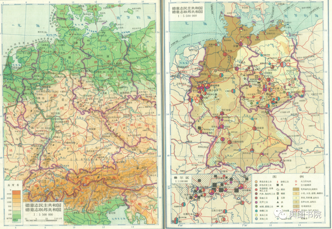 德国在当时分为民主德国和联邦德国。这幅图也比较独特,之前的地图上不承认联邦德国,只画民主德国。之后的地图,不再把两德放在一个幅面,要么把两德和中欧诸国捆绑,要么把民主德国和波兰放在一起。西柏林在50年代的地图曾经绘制出来,但是后来的地图不予表示。