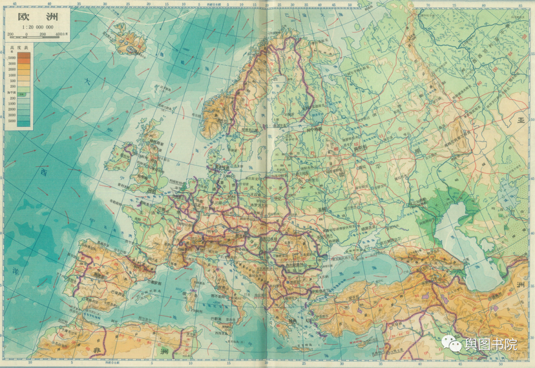 这系列地图没有展示洲界,可能还没有统一意见。当时不同的资料,亚欧界限差异比较大。欧洲地形图描绘了黑海,地中海的洋流,非常精细。