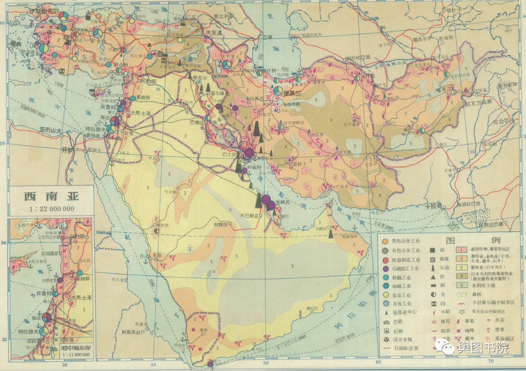 西南亚资源以石油为主,从经济图看,土耳其是区域内相对比较发达的国家。地图上看,当时波斯湾的石油工业已经兴起。