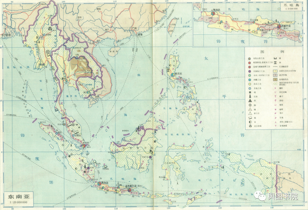通过这张东南亚图,特别是经济那一张,能够看出当时东南亚范围不包括越南。1963年,西伊里安脱离荷兰,地图上已经体现。马来西亚和今天不同,当时是马来亚,和英属的沙捞越,北婆罗洲。东南亚在60年代时候,整体还比较薄弱,除了爪哇岛有一定的工业以外,大部分地方还是以农林为主。