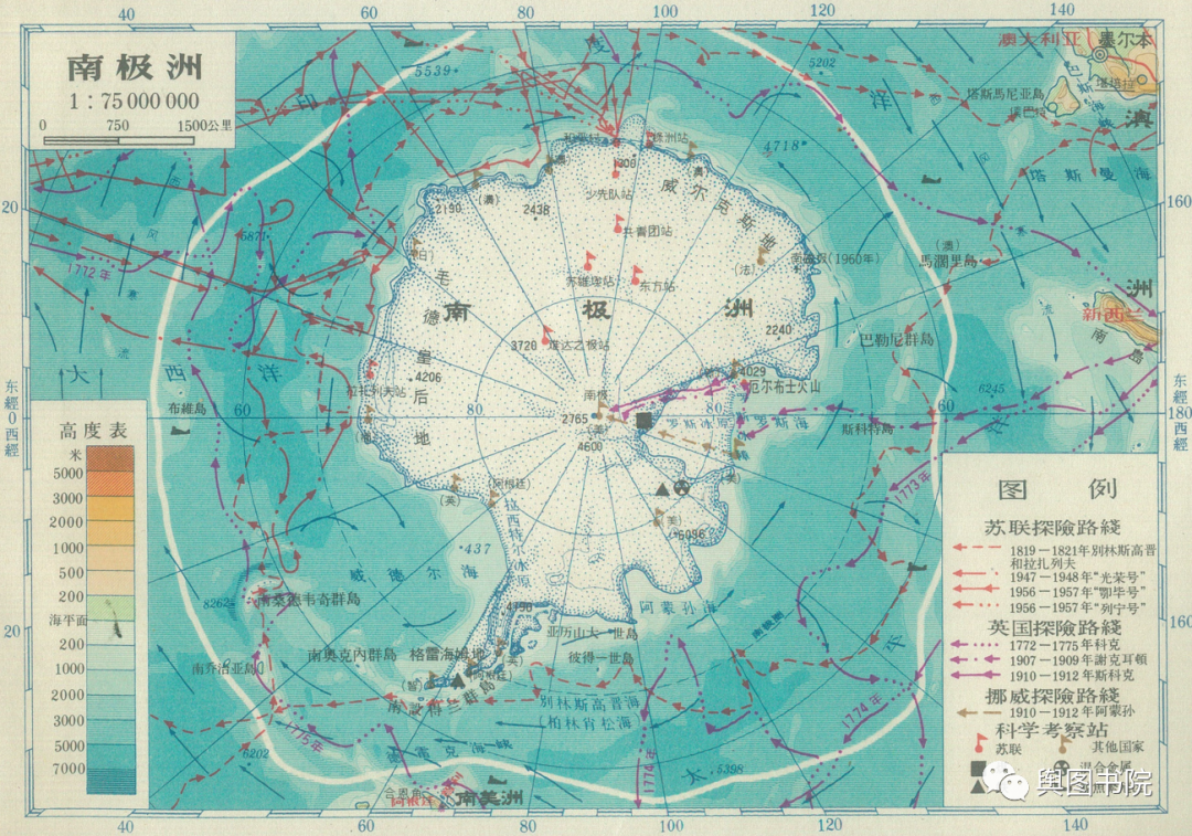 南极洲的图,仔细描绘了苏联,英国,挪威探险家探险路线,并着重记录了苏联在南极洲的科考站。虽然远在祖国最南端,但是这里苏联的存在感一点也不少。