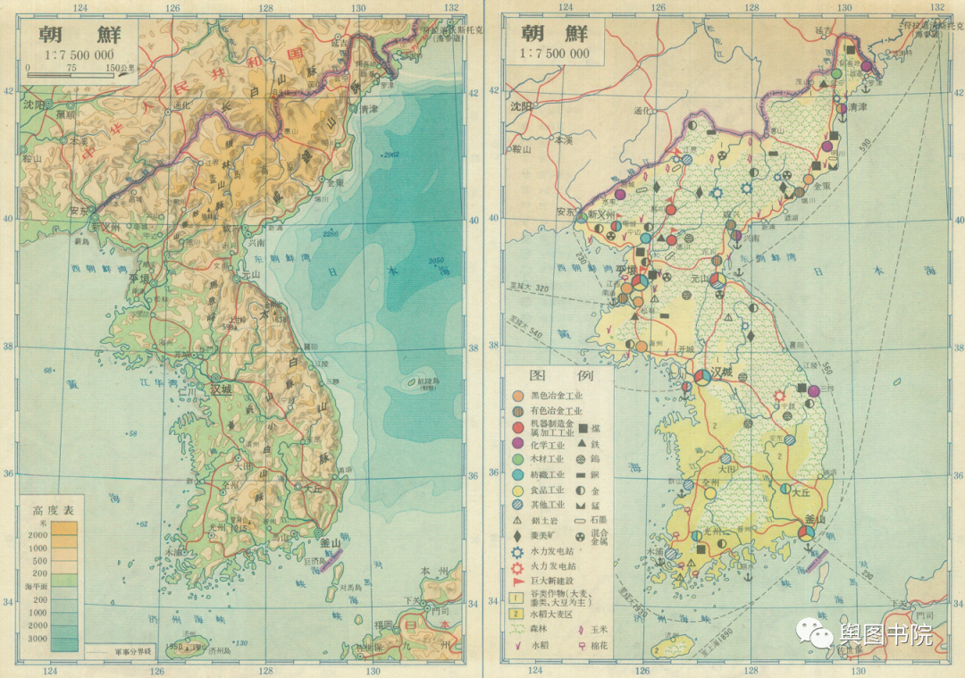 朝鲜在国家介绍中排名第一位,说明朝鲜在当时的重要性。地图清晰反映了朝鲜的地形,即北部高亢的山地和高原,东部海岸山脉,西部丘陵平原和破碎海岸。从朝鲜经济看,北部地区有丰富的矿产资源,南部(实际上是韩国,当时不承认)则是重要的农业区。