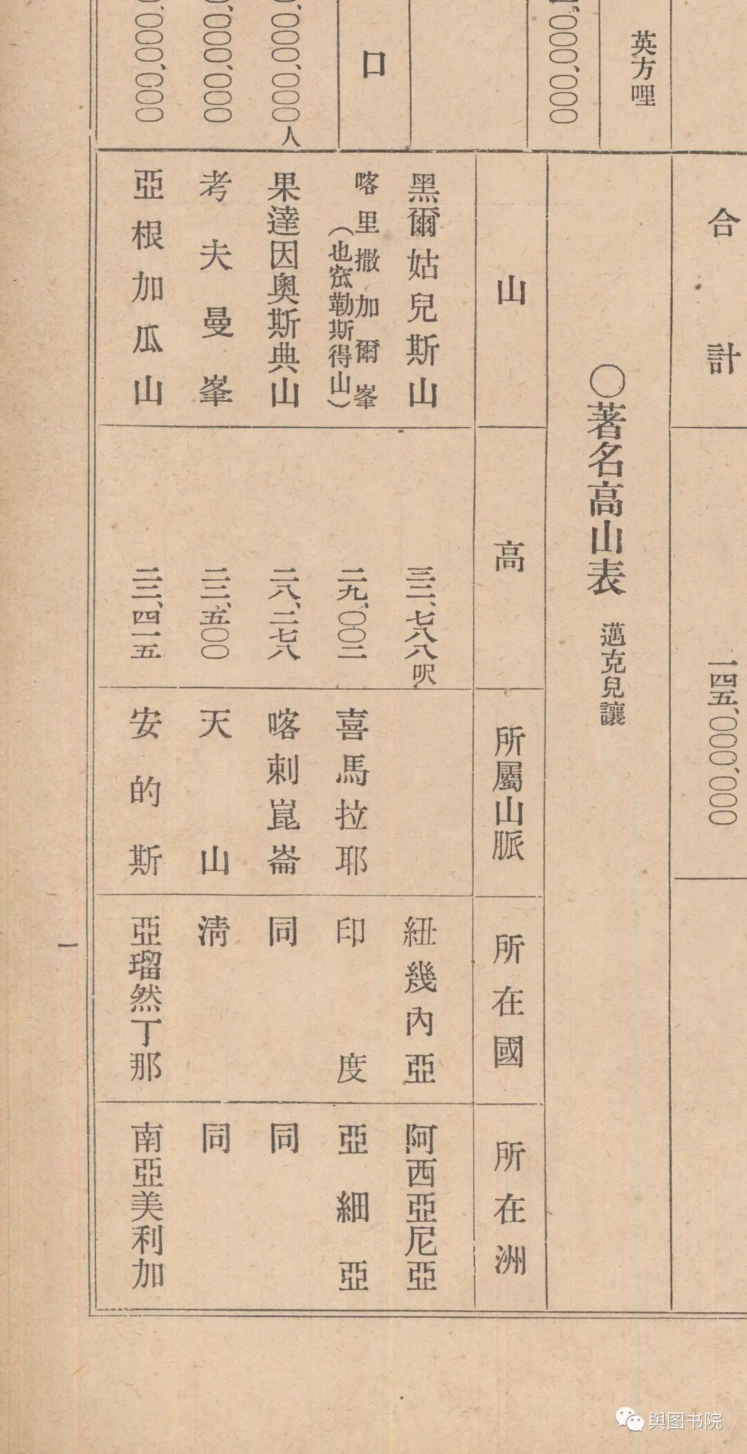 (清朝地理教材关于世界高山的记载,其中的黑尔姑儿斯峰就是查亚峰,位于巴布亚新几内亚,当时测量高度32788英尺,也就是9993米。当时在中国的测绘比较薄弱,五大高山唯一上榜的中国高山是考夫曼峰(也就是后来的列宁峰),而这座山在教材出版的时候,已经被俄罗斯占领,清朝教材并未承认这一占领事实,仍然标注在中国领土)