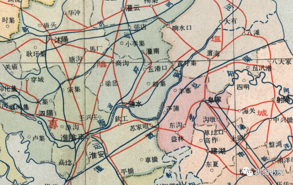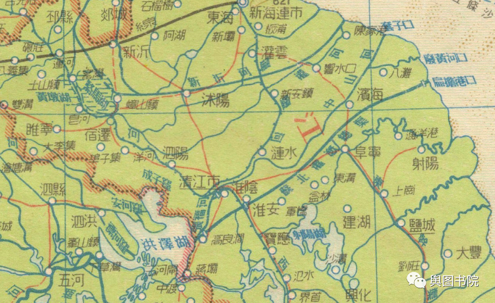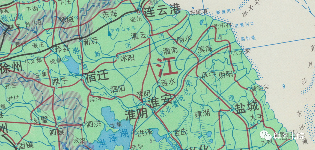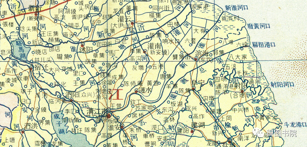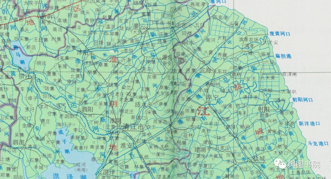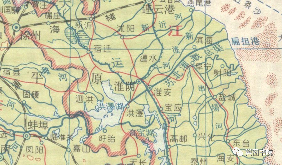 淮河下游因为黄河南下改道,失去了自己天然河道,地图上注记反馈了建国以来变迁和人为改造。