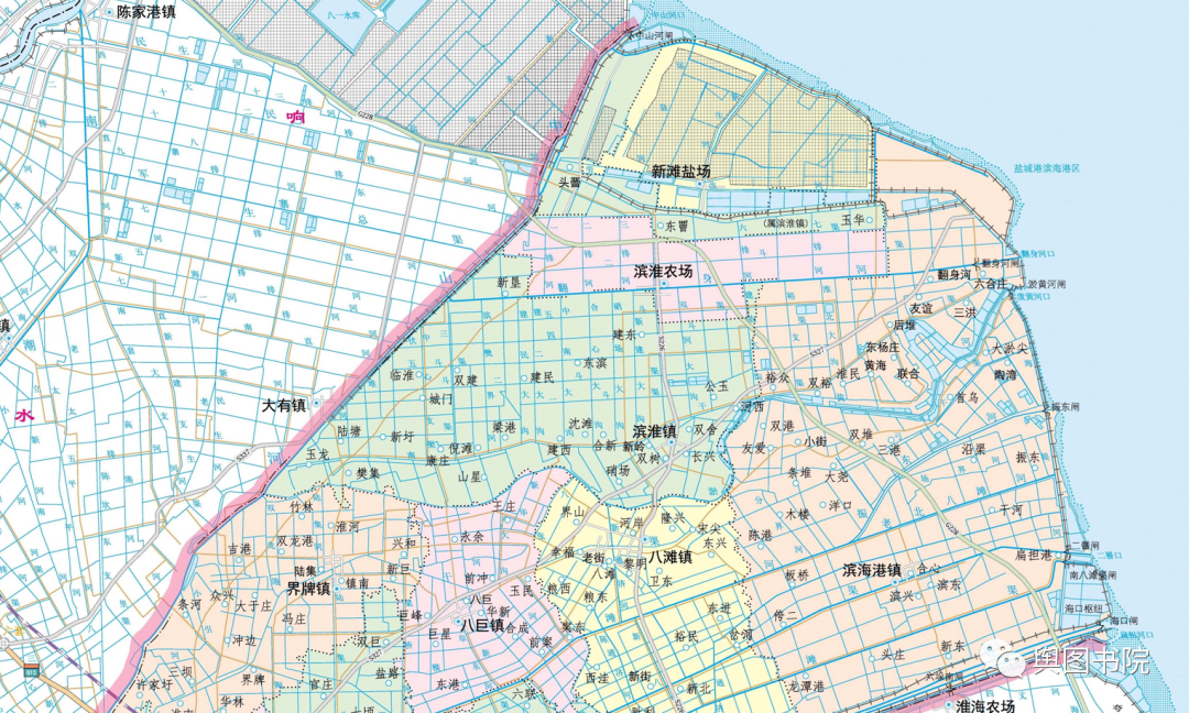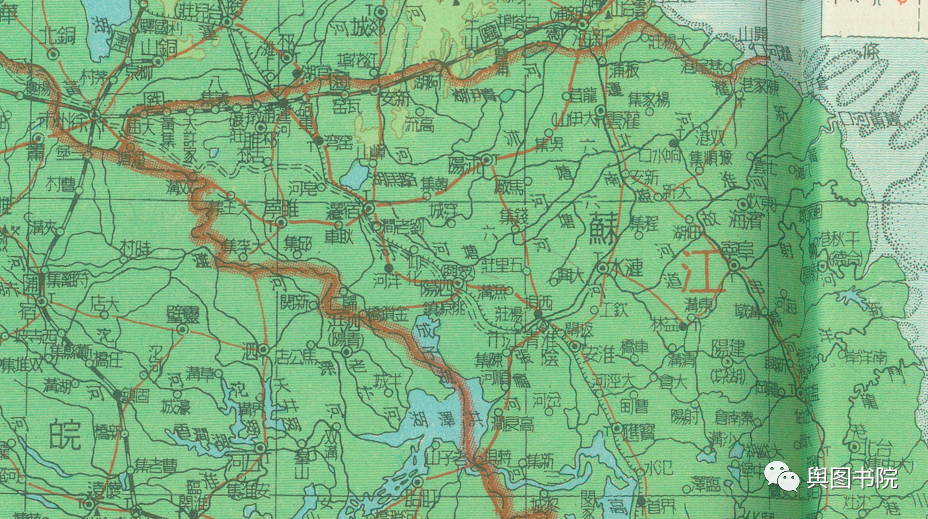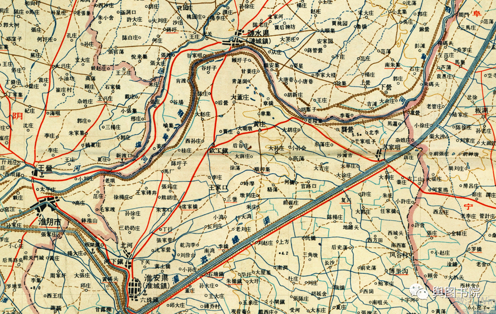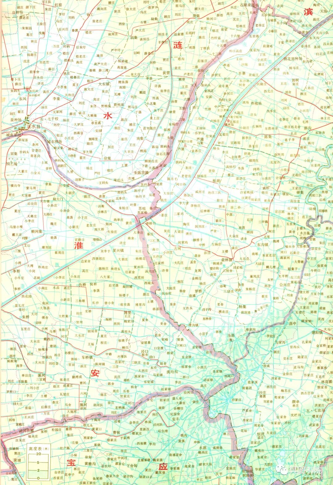 淮河下游因为黄河南下改道,失去了自己天然河道,地图上注记反馈了建国以来变迁和人为改造。
