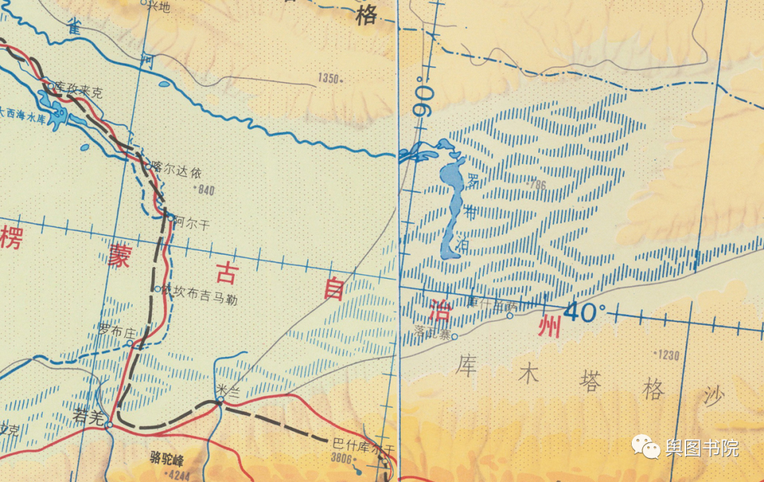 1992年地图上,在干涸许久后,罗布泊第一次正式消失。蓝色的水体变成了黑色戈壁符号。塔里木河下游321公里也彻底断流。从此罗布泊水体在正式地图消失。