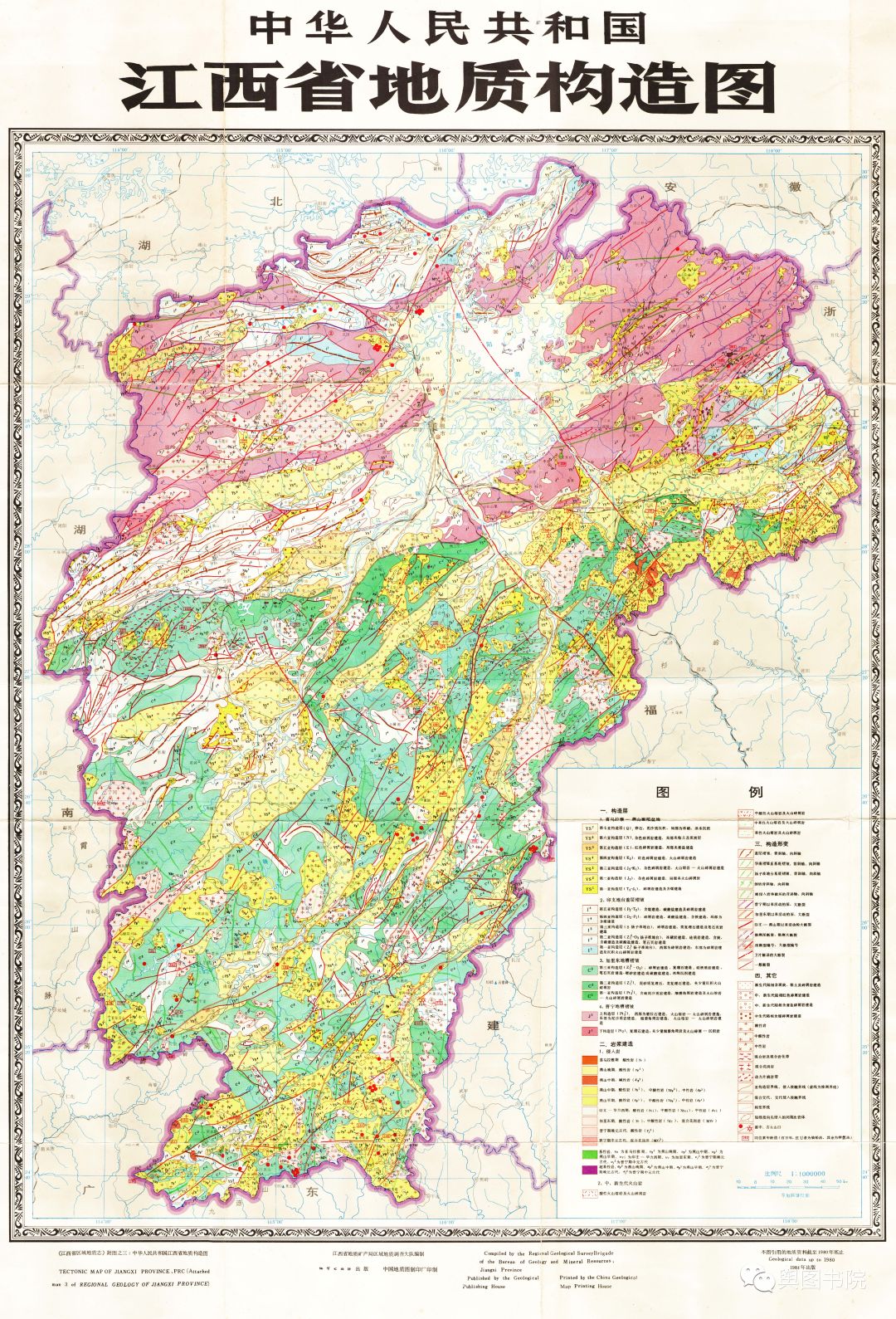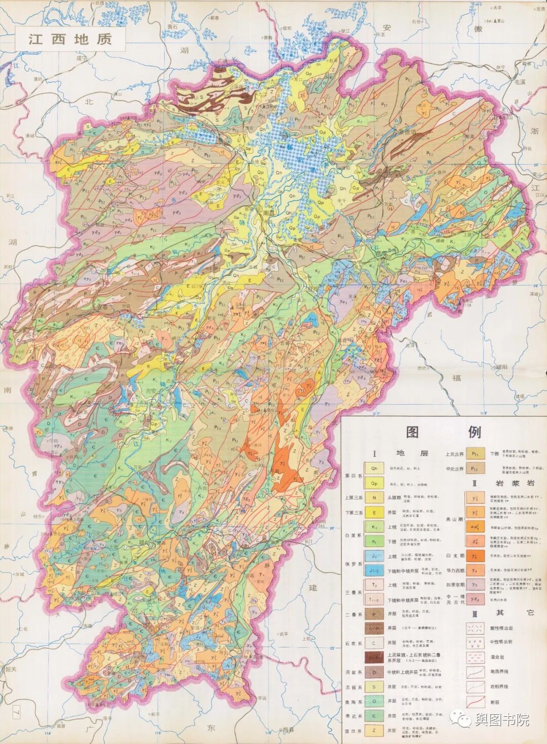 (江西省地质图,点击查看大图。从地质图看,鄱阳湖区地层露头最为年轻,主要是第四纪地层。图中地层是水相沉积为主,记录着湖盆沉积的历史)