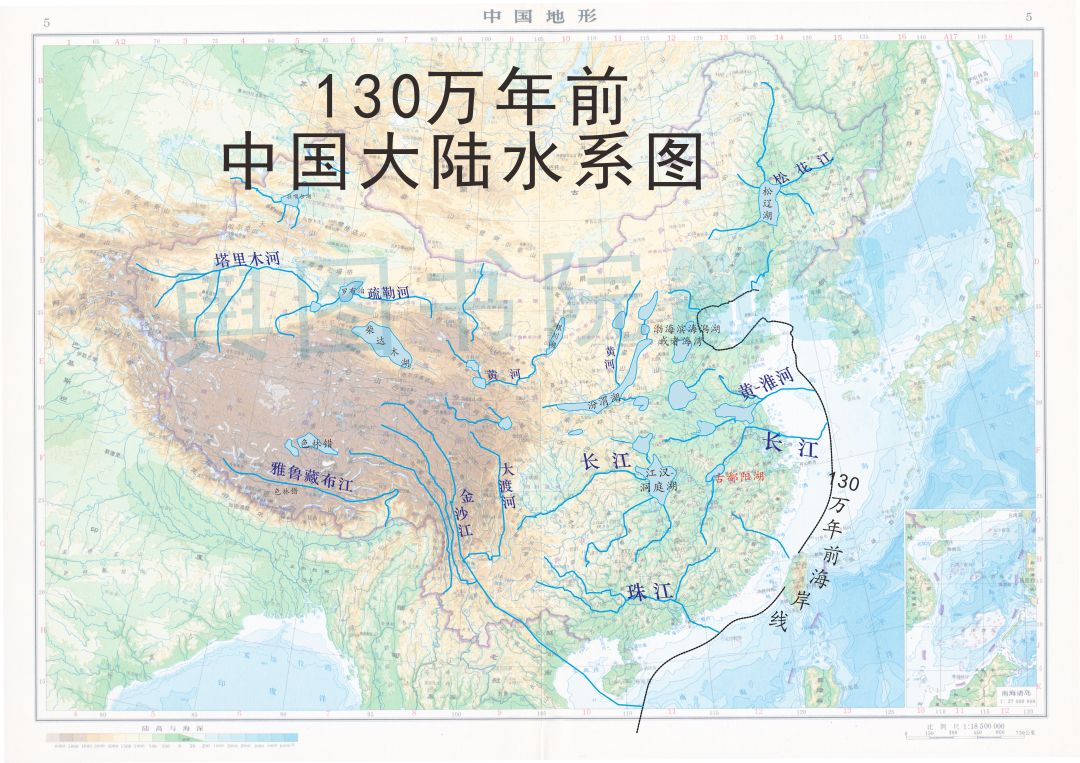 (130万年前水系图,由于北部断裂,当洞庭湖还是咸水湖的时候,鄱阳湖已经和古长江下游沟通。气候朝着相对湿润的方向演变,也利于鄱阳湖的延续)